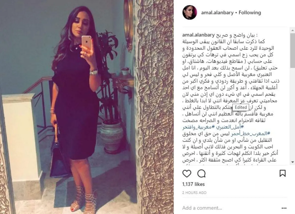 أضافت: أنا أمل العنبري مغربية الأصل وكلّي فخر، وليس لي ذنب إذا ثقافتي وطريقة ردودي وفكري أكبر من أغلبية الجهلاء . أعد وأكرر، لن أتسامح مع أيّ أحد يُقحم اسمي في أي شيء من دون أي إذن مني، لأن محاميتي تعرف عز المعرفة أنني لا أبدأ بالغلط ، ولكن إن كانت حجّتكم بالتطاول عليّ أنني مغربية، فأقسم بالله العظيم أنني لن أتساهل ، ثقافه الاحترام انعدمت و الصراحة مصخت #أمل_العنبري #مغربية_وافتخر #المغرب_خط_أحمر ليس من حق أي مخلوق التقليل من شأني، أو من شأن بلدي، وإن كنت أحب الكويت والبحرين، فذلك لأنني أصيلة ولا أًنكر خير بلد! اتكلم لهجات كثيرة وأُتقنها ، أحرص على القراءة كثيرًا كي أصبح مثقفة أكثر ، أحرص دومًا على أن أكون أحسن من نفسي، ولكن المسالة أصبحت لا تطاق ، لم أولد لإرضاء أحد حتى ولو كنت فنانة، مَن لن يحترمني لن أرحمه !