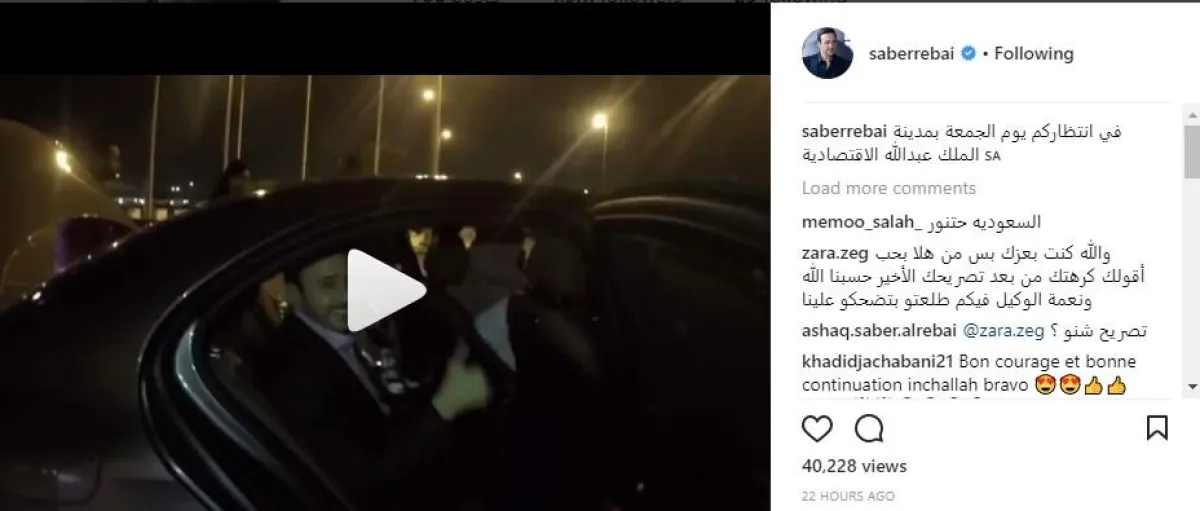 المطرب التونسي صابر الرباعى نشر مقطع فيديو عبر صفحته على موقع انستقرام، وذلك أثناء وصوله إلى السعودية، حيث من المقرر أن يقوم بإحياء حفل غنائي لأول مرة يوم غد الجمعة، وقال صابر فى الفيديو: "سعيد بوجودي فى السعودية، وإحيائي حفلًا غنائيًّا لأول مرة للشعب السعودي، وبحضور الجاليات العربية وأتمنى أن يتم تكرار هذه الزيارة أكثر من مرة.