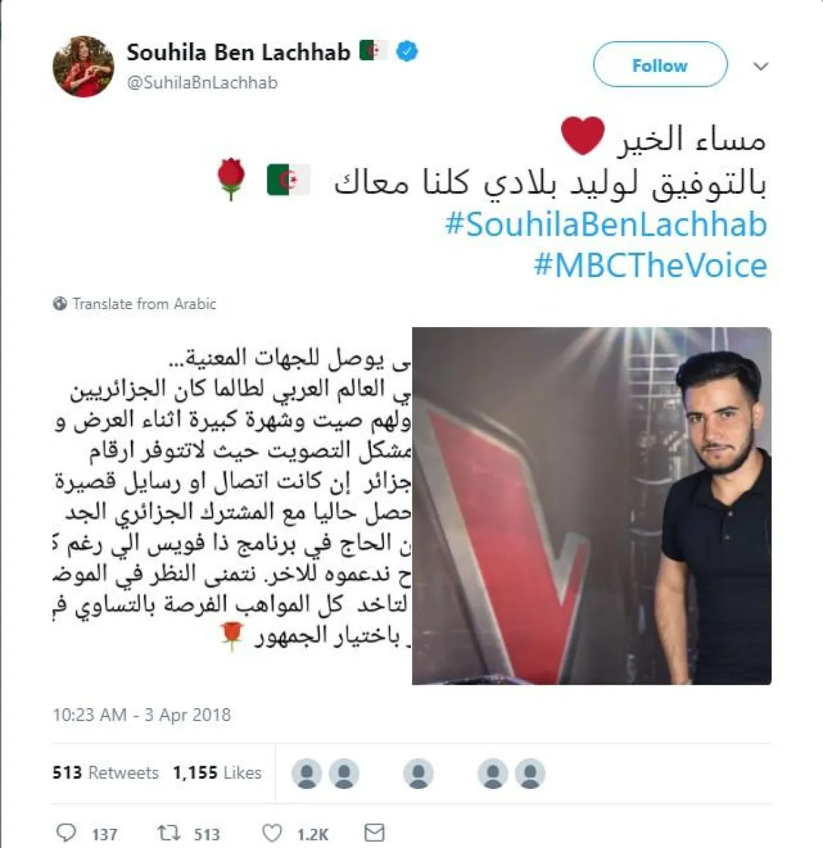 وأضافت: الأمر نفسه الذي يحصل حاليًّا مع المشترك الجزائري الموهوب جدًّا حسين بن الحاج في برنامج ذا فويس، فرغم كل شيء كلنا معاه وسندعمه للآخر. نتمنى النظر في الموضوع في أقرب الآجال، لتأخذ كل المواهب الفرصة بالتساوي في إمكان الاستمرار باختيار الجمهور.