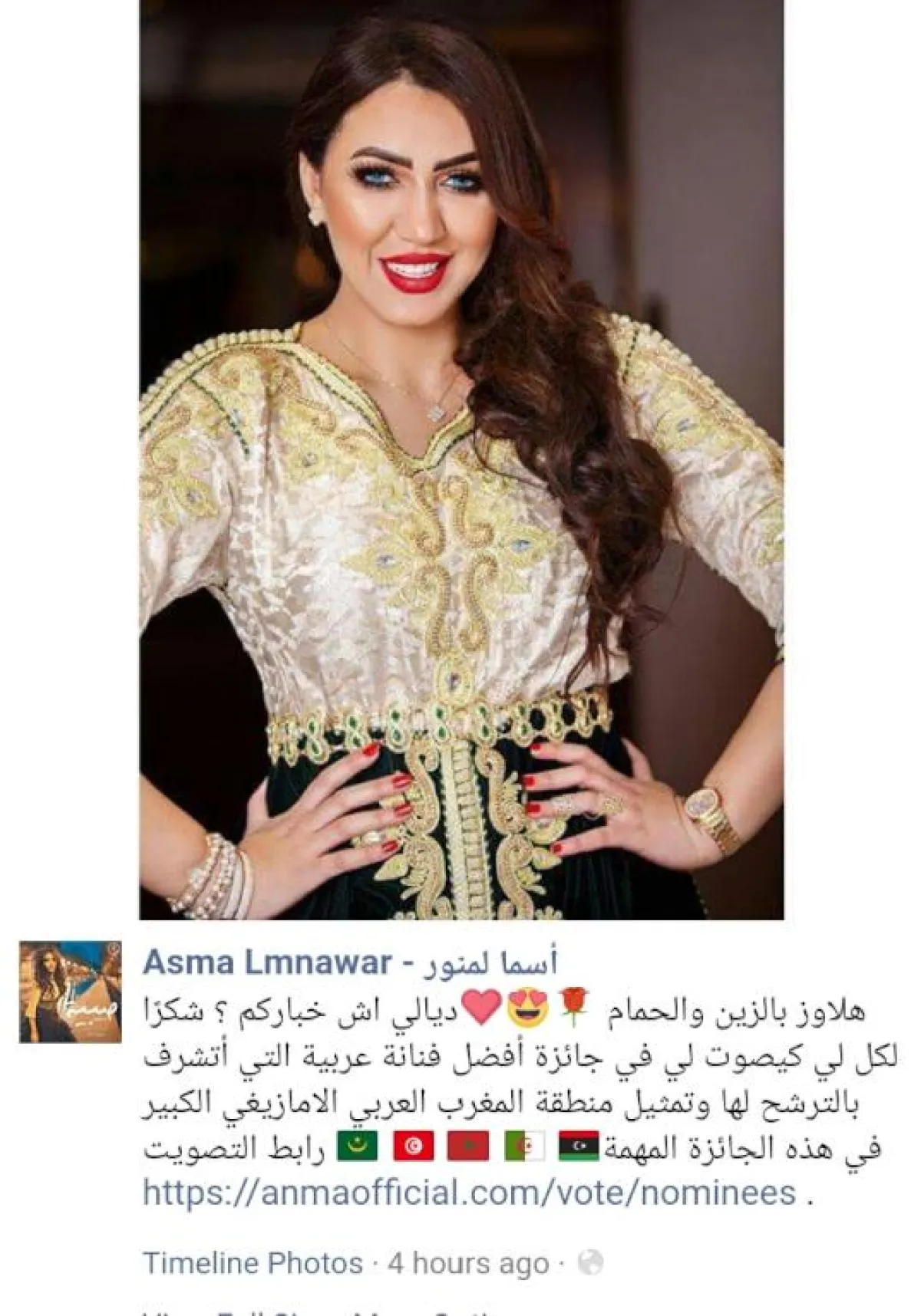 وشاركت أسماء، فرحتها عبر صورة لها على صفحتها الخاصة على موقع التواصل الاجتماعي الفايسبوك، كالعادة بالقفطان المغربي، وعدسات لاصقة باللون الأزرق السماوي، أرفقتها بتدوينة ورابط التصويت جاء فيها: " أهلًا أحبائي، كيف حالكم؟ شكرًا لكل من صوّت لي من أجل الفوز بحائزة أفضل فنانة عربية، التي أتشرف بالترشّح لها، وتمثيل منطقة المغرب العربي الأمازيغي الكبير في هذه الجائزة".