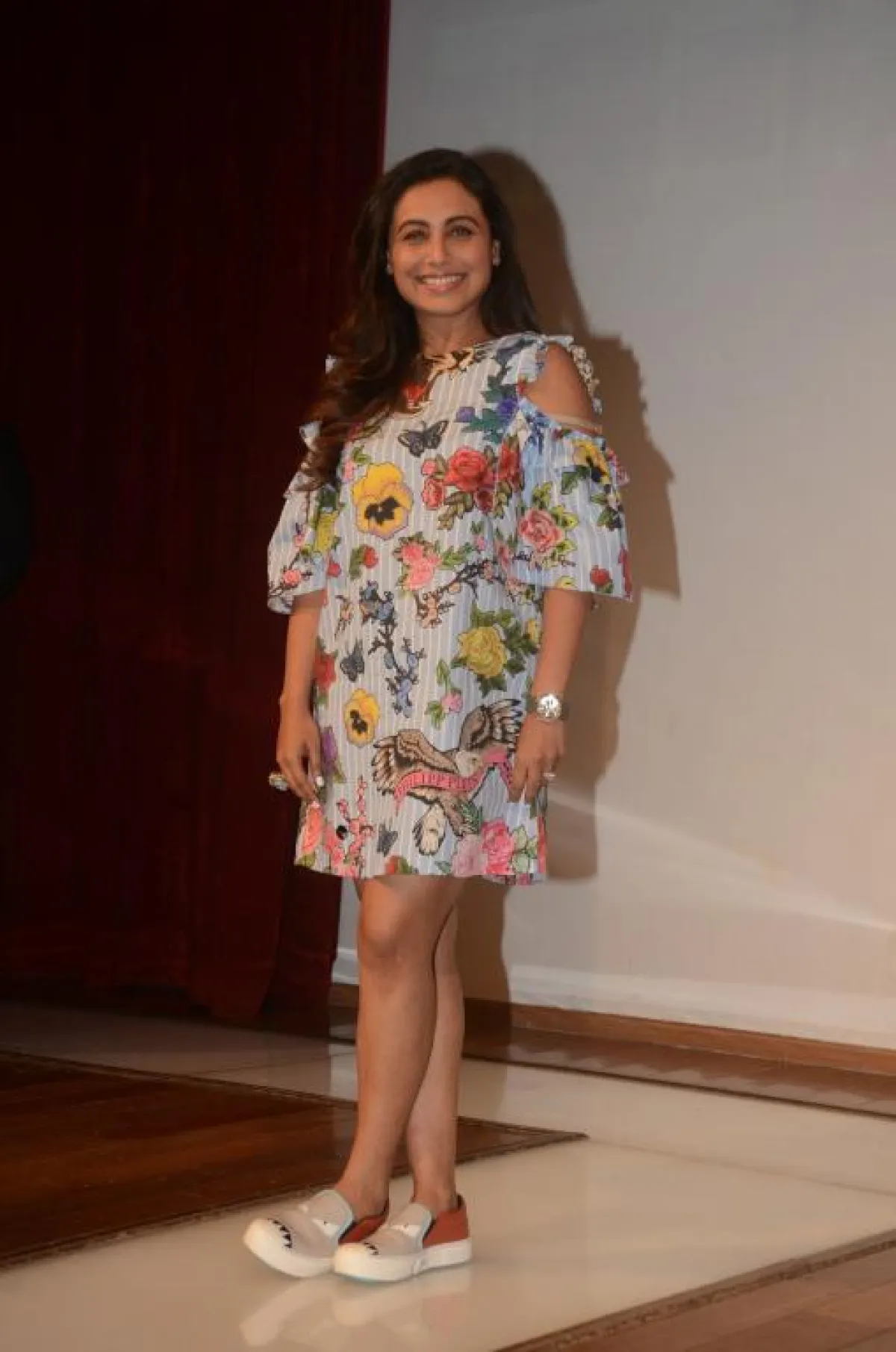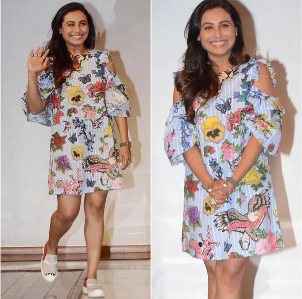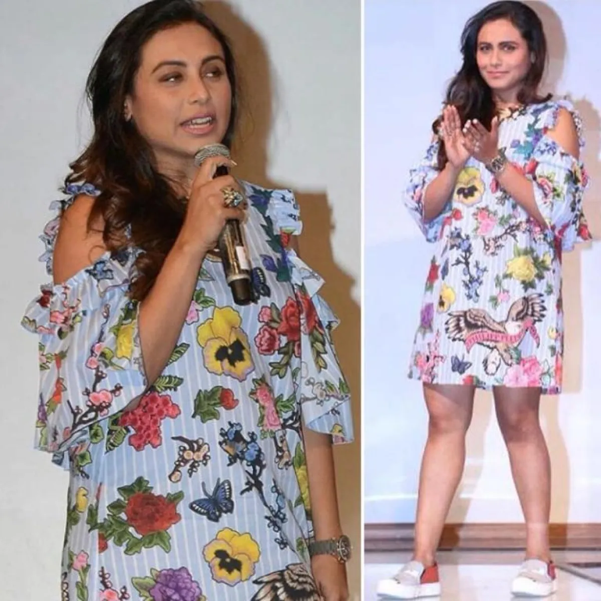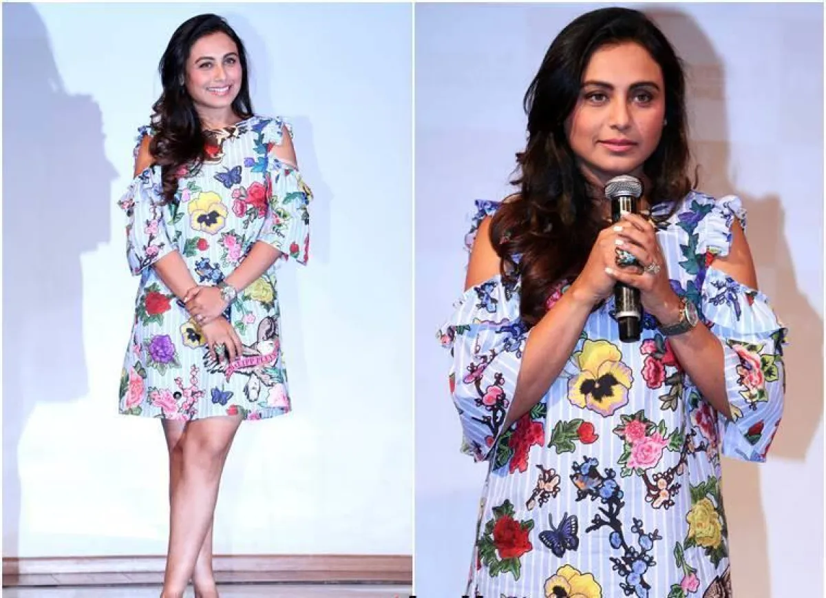 اطلالة موخرجي لفتت الأنظار إليها أثناء إطلاق أول إعلان وبوستر لفيلمها الجديد "Hichki"، فاختارت فستانًا قصيرًا مطبّعًا بالرسوم والورود، والفراشات الملونة والطيور، وكأنه حديقة تنبض بالحياة والربيع.