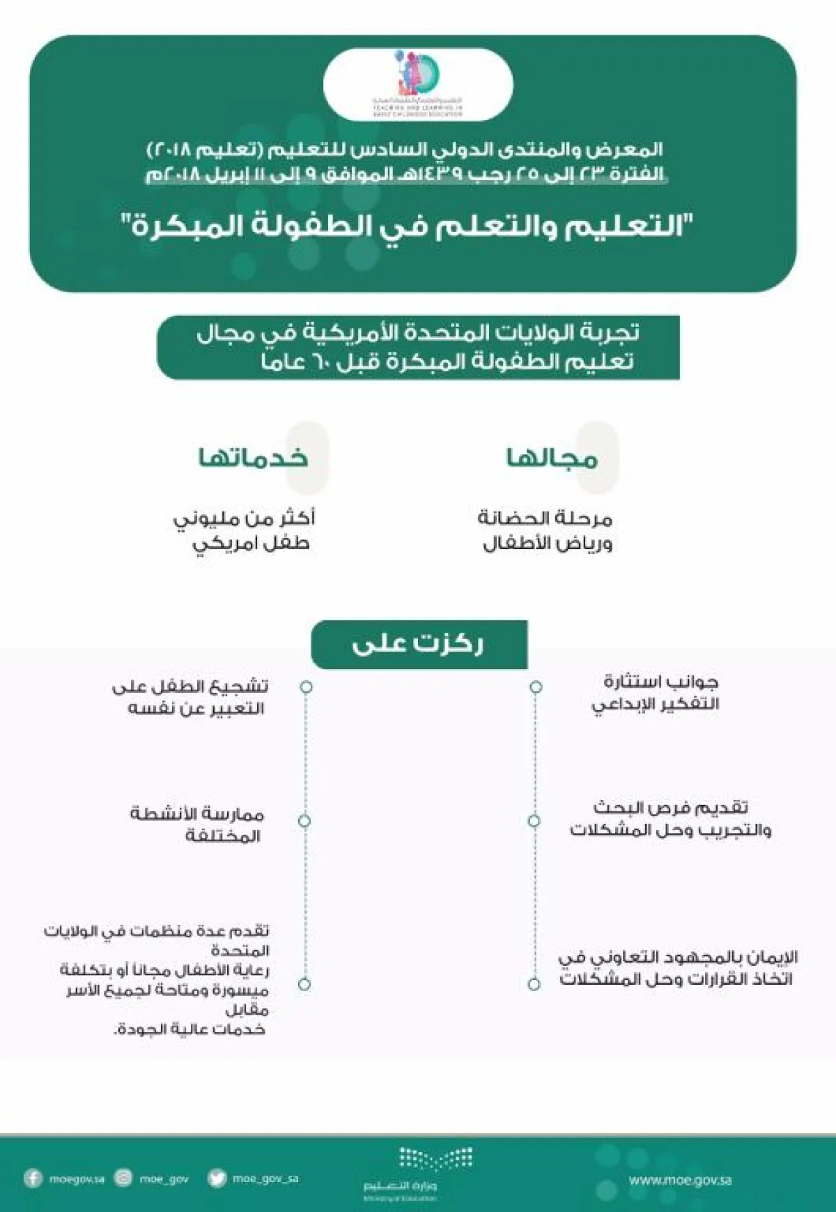 وقالت: يستحضر التعليم الأمريكي تجربته الريادية في مجال الطفولة المبكرة خلال الدورة الحالية لـ "تعليم 2018" نتيجة امتلاكه خبرات طويلة في مجال الحضانة ورياض الأطفال منذ العام 1856م، حتى باتت الخدمات الآن تشمل أكثر من مليونَي طفل أمريكي.