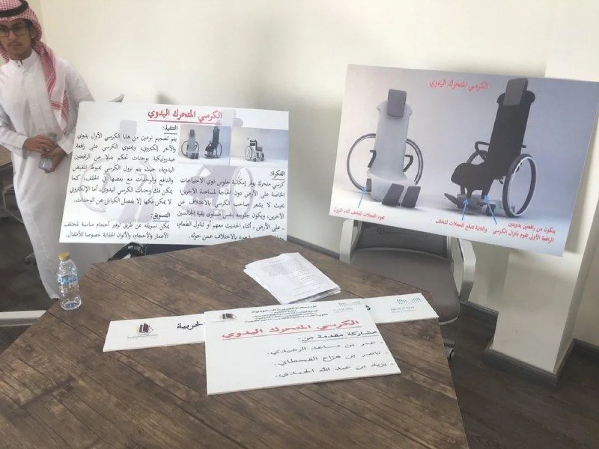 وقدَّم فكرة الابتكار الطلاب عمر بن مساعد الرشيدي، وناصر بن هزاع القحطاني، ويزيد بن عبدالله الحمدي من ثانوية الأبناء في كلية الملك عبدالعزيز الحربية، وتهدف إلى عدم إشعار صاحب الكرسي بالاختلاف عن الآخرين بالجلوس بنفس مستوى بقية الجالسين على الأرض أثناء الحديث معهم، أو تناول الطعام، حيث يتكوَّن الكـرسي المتحرك اليـدوي من رافعتين يدويتين، تقـوم الأولى بإنـزال الكرسي، بينما تـدفع الأخرى العجلات إلى الخـلف أثنـاء النزول. بحسب "سبق".