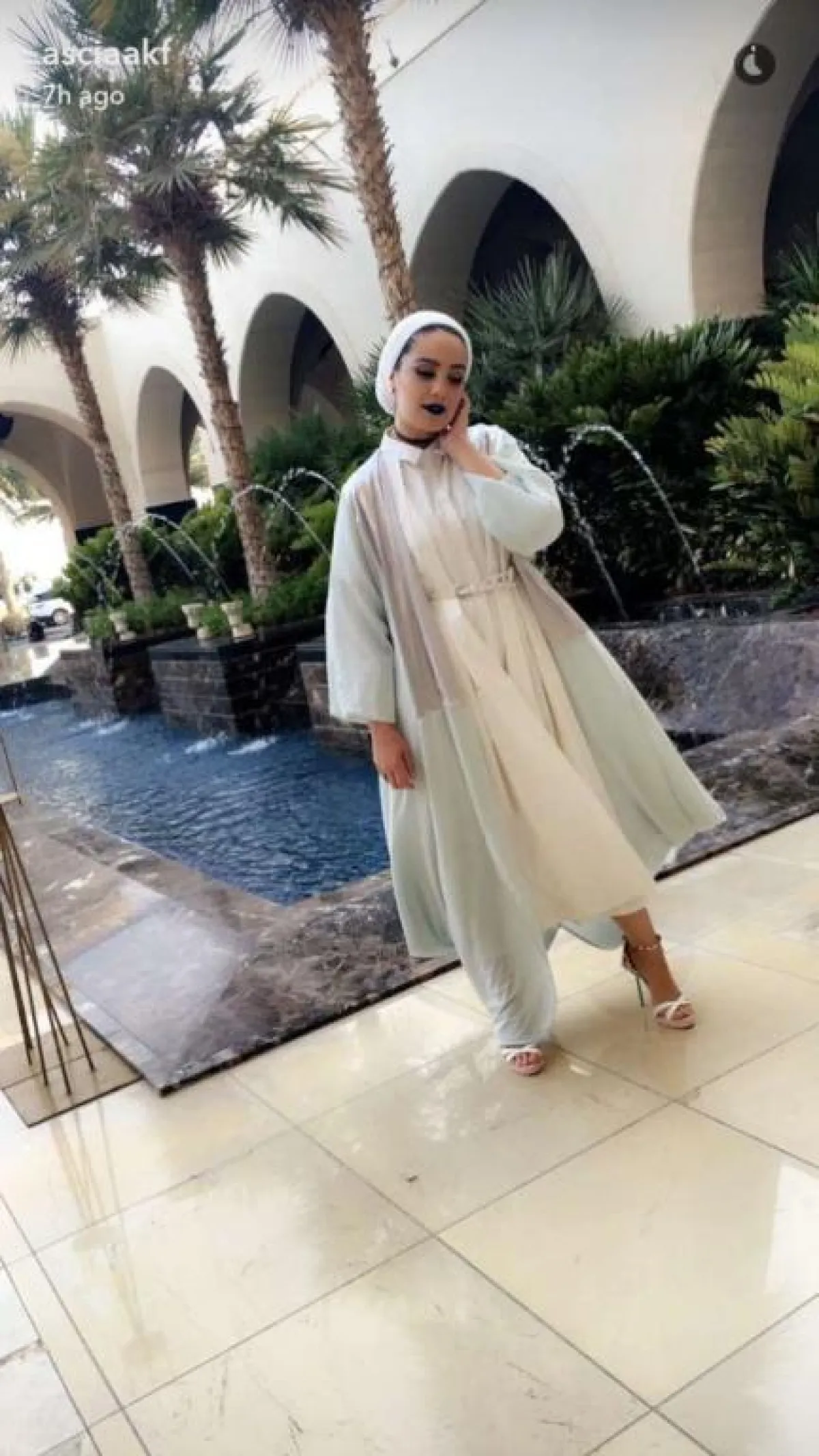 تتبع دائمًا فاشنيستا الخليج المحجبة مرمر محمد mr mr شكلاً مختلفاً كليًا وإطلالة فخمة حتى عند اختيارها ارتداء القفاطين، إذ اختارت اللون الذهبي مع الأسود، وحزام الخصر الأحمر الجريء، وارتدت معه طرحة بيضاء.