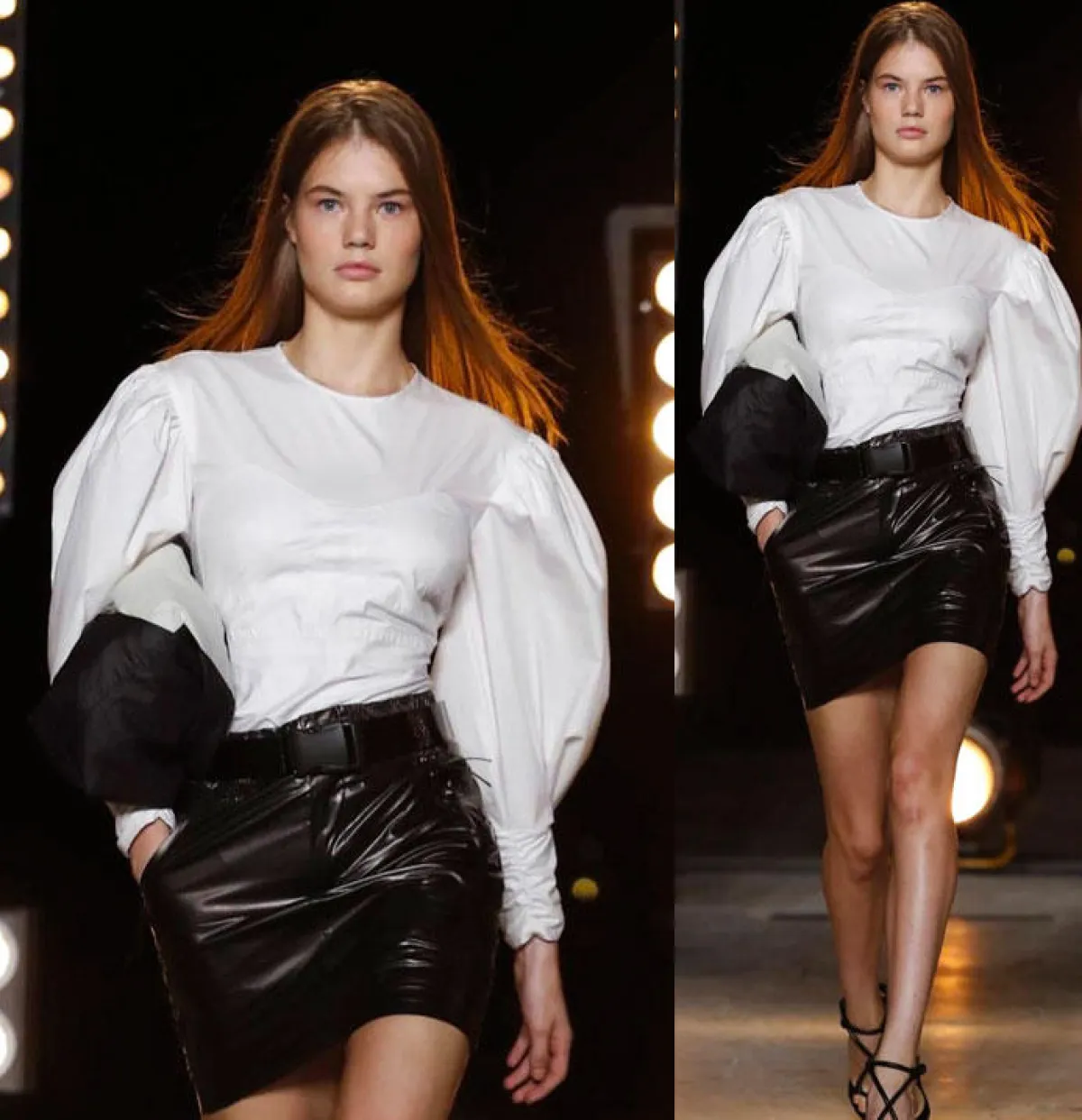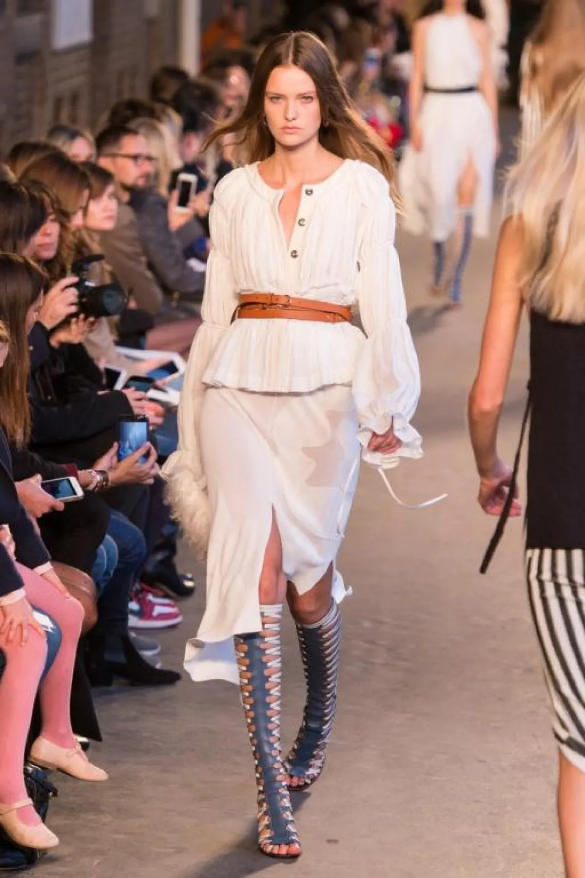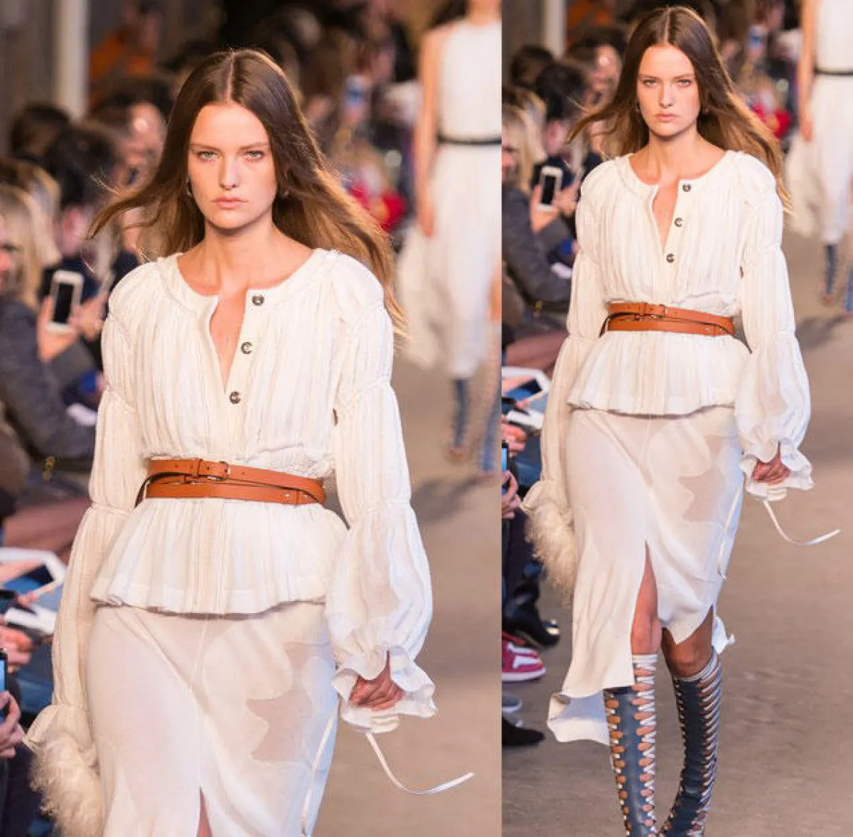 أعجبتنا الكنزة البيضاء من ماركة ألتوزارا Altuzarra، والتي ارتدتها العارضة مع تنورة باللون الأبيض، وتحتاج هذه الكنزة إلى حزام جلد أنيق حول الخصر ليضيف لمسة أنثوية مع هذا الموديل الناعم.