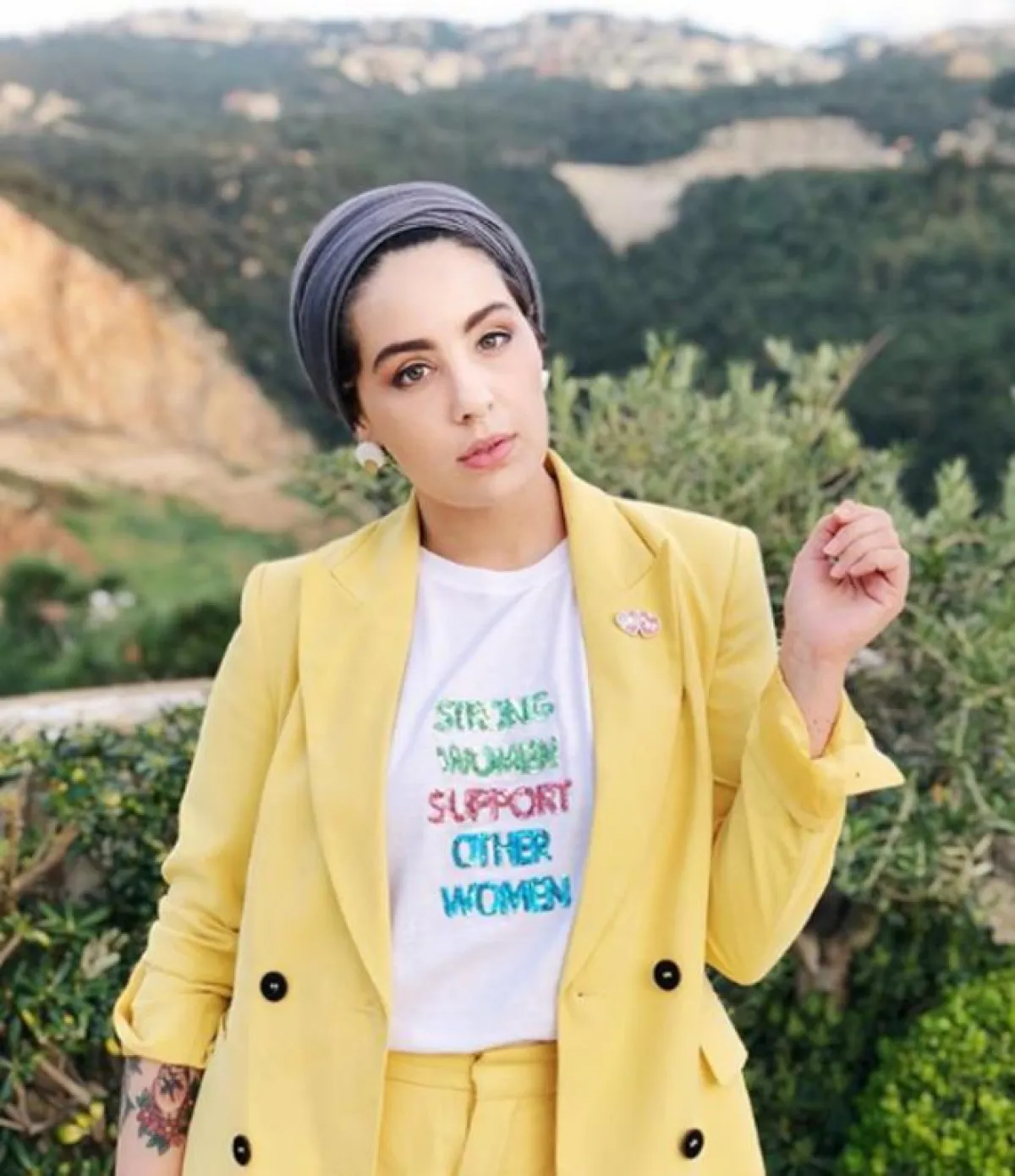 أفضل طريقة لاعتماد صيحة التيشرت هي ارتداؤها تحت البدلة الكلاسيكة ل إطلالة كاجوال، سواء كانت شتوية أو صيفية، ويمكنك أن تضعي مع البدلة حزام إحدى علامات الماركات العالمية مثل غوتشي GUCCI، كما فعلت الفاشنيستا آسيا ascia باختيار بدلة باللون الأصفر الزاهي، مع توربان رمادي.