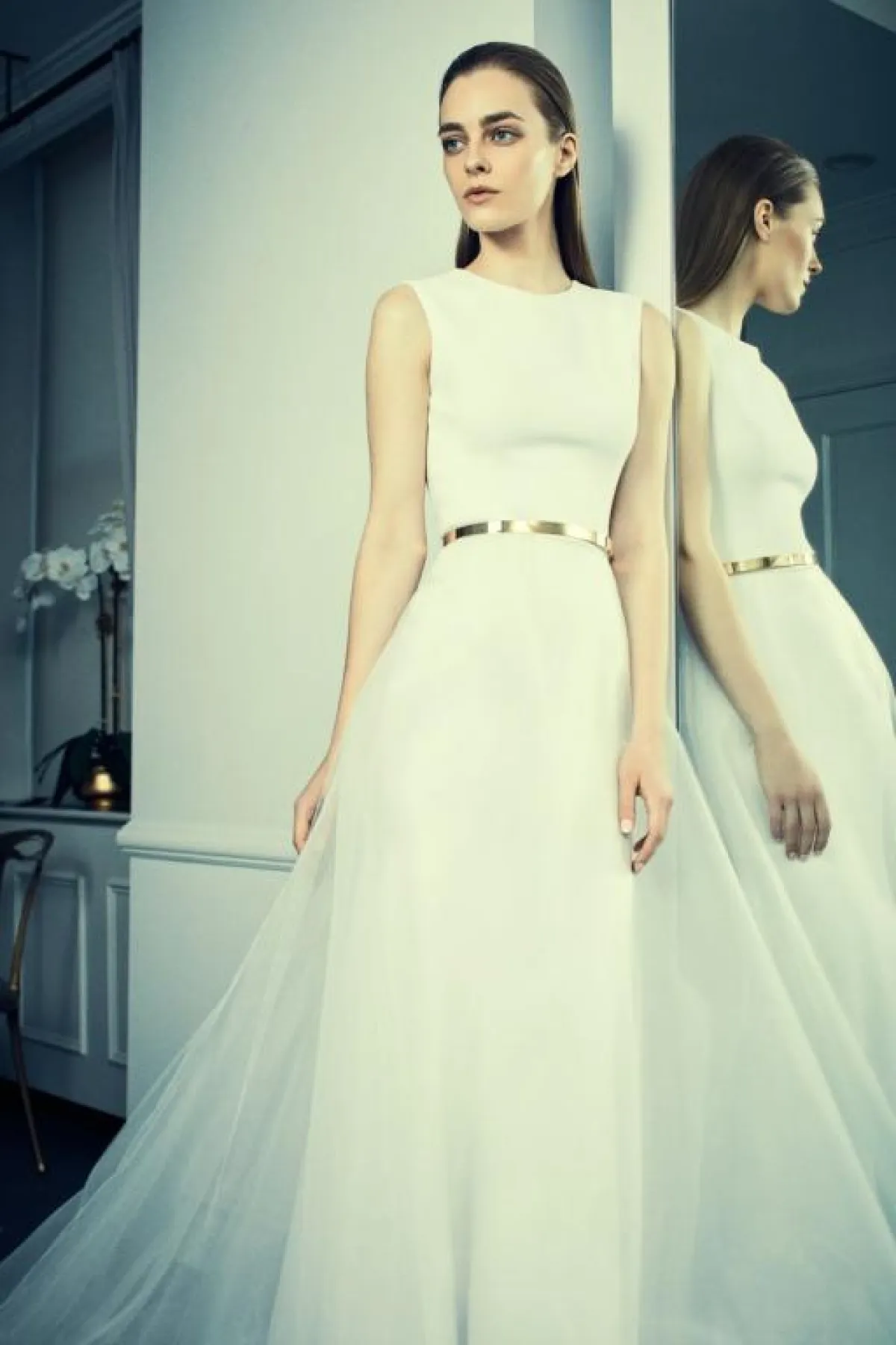 وللعروس التي تبحث عن فستان زفاف ناعم وراقٍ في الوقت نفسه، نرشح لكِ تصميم الـA Line بالتنورة الواسعة قليلاً، مثل فساتين زفاف Casablanca، جيني باكهام Jenny Packham، ماركيزا Marchesa، وثيا Theia.