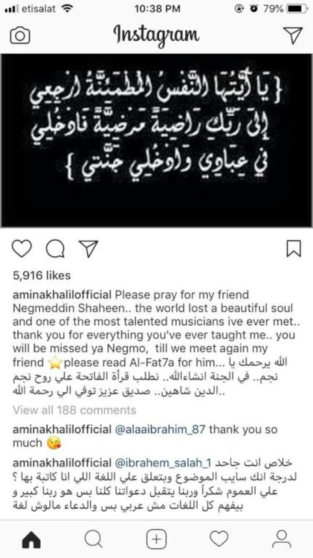 نعت الفنانة أمينة خليل أحد أصدقائها المقربين، بنشر آية قرآنية، عبر حسابها الرسمي على موقع تبادل الفيديوهات والصور "انستقرام"، وعلقت أمينة على الصورة "قائلة: الله يرحمك يا نجم"، طالبة من محبّيها قراءة الفاتحة لصديقها نجم الدين شاهين، والدعاء له، لتنهال عليها العديد من التعليقات المؤازرة، إلا أنّ بعض المعجبين علّق على لغتها العربية، واصفًا إياها بكونها أنها غير واضحة وغير مفهومة، لتشتبك أمينة مع أحدهم قائلة : "إنتَ جاحد سايب الموضوع الأصلي وبتعلّق على لغتي العربية، على العموم ربّنا بيفهم كل اللغات مش العربية بس".