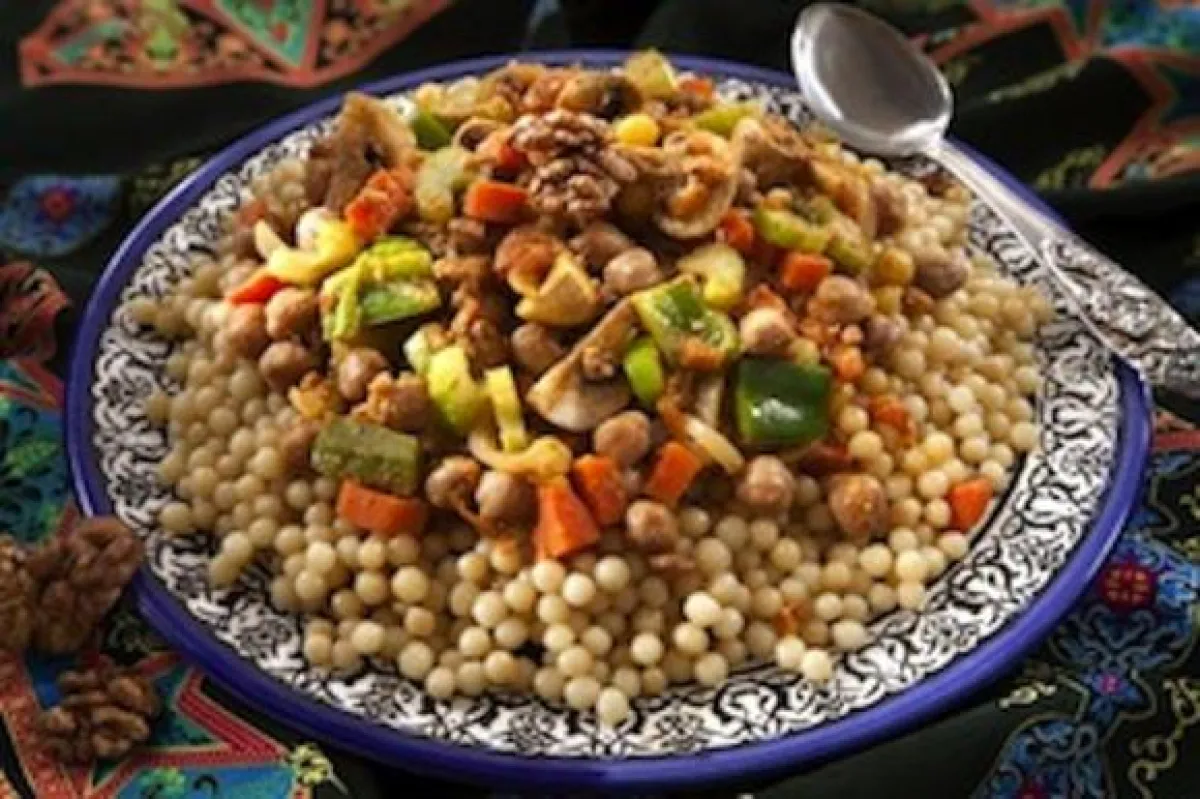 3- في الوقت عينه، في قدر سميكة القاعدة ضعي المغربية والسمن، وقلبي على النار لمدة دقيقة أو دقيقتين، وأضيفي المرق، غطي القدر وأبعديها عن النار، قلبي المغربية بالشوكة لكي تتفتح الحبات جيداً، وأضيفي المزيد من المرق إذا بقيت المغربية جافة. يجب أن تتفتح حبات المغربية تماماً، وتلين.