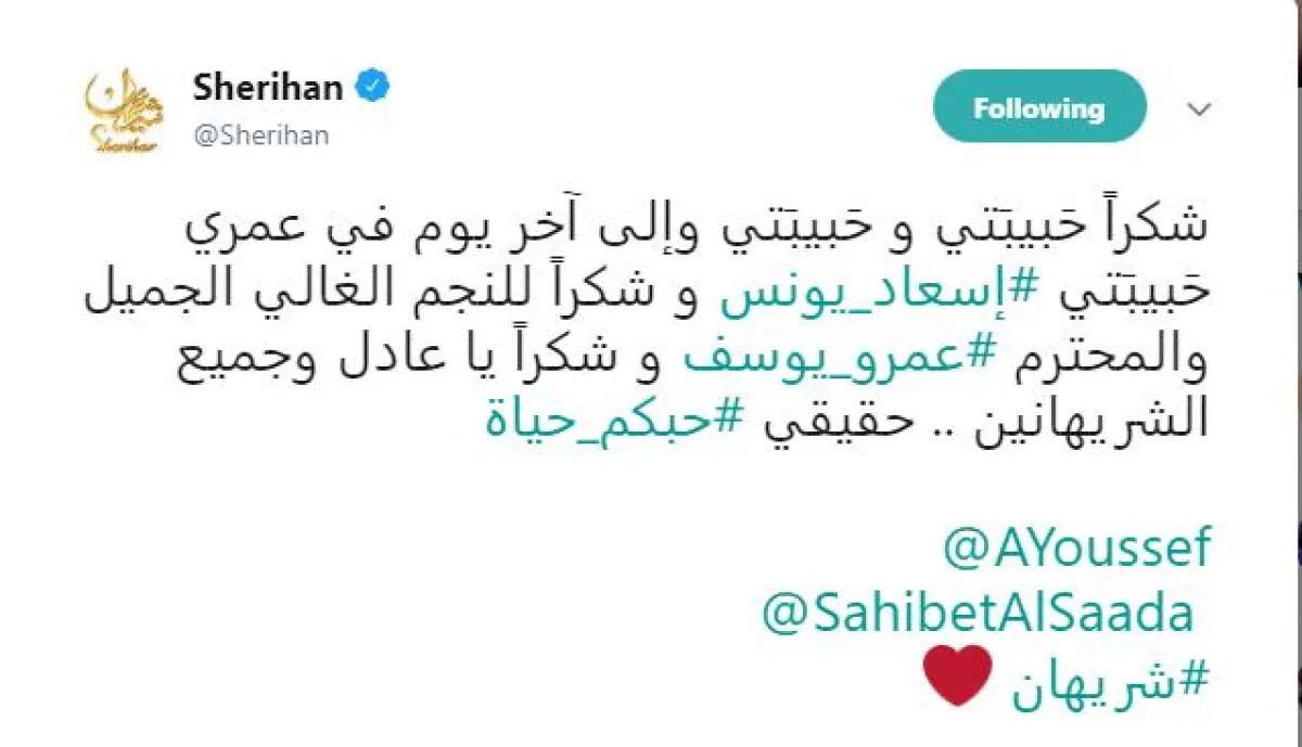 وغردت شريهان عبر حسابها الشخصي بموقع التدوين تويتر لرد التحية للإعلامية إسعاد يونس وضيفها على الحلقة الأخيرة من برنامج "صاحبة السعادة" الفنان عمرو يوسف قائلة : شكرًا حَبيبَتي و حَبيبَتي وإلى آخر يوم في عمري حَبيبَتي إسعاد يونس و شكرًا للنجم الغالي الجميل والمحترم عمرو يوسف وجميع الشريهانين .. حقيقي #حبكم_حياة".