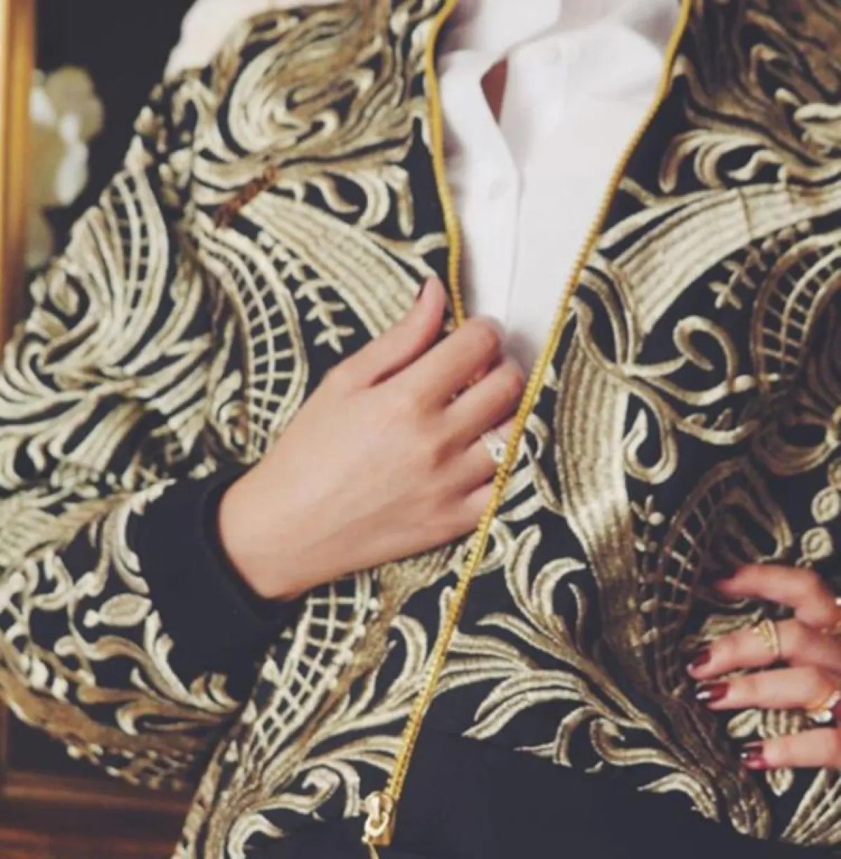 حتى إذا كنتِ لا تحبين التخلي عن فخامتك مع ملابسك الكاجوال العادية، فحتمًا سيعجبك هذا البلايزر الأسود ذو التطريزات الذهبية اللامعة، لمناسباتك النهارية المهمة.