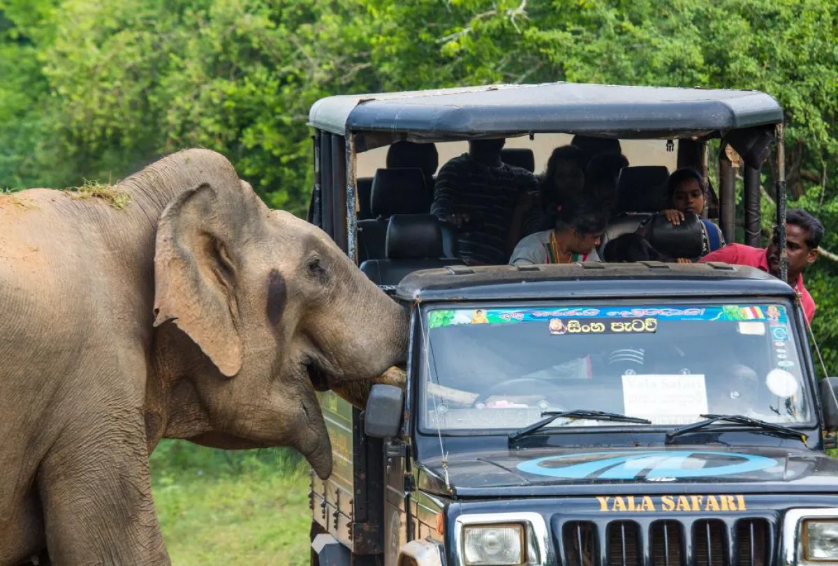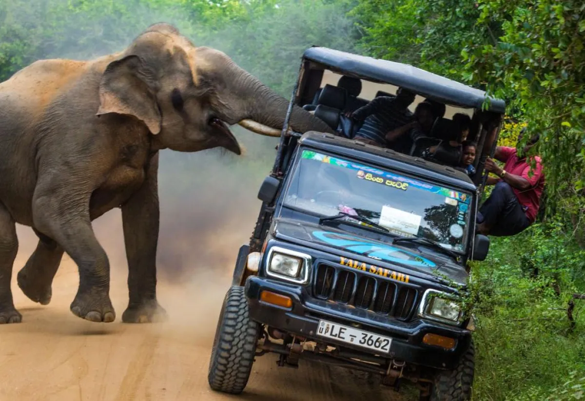 أوشكت رحلة سفاري أن تتحول إلى كارثة عندما أدخل فيل رأسه بسيارة من نوع جيب؛ بحثًا عن الطعام، وكاد يقلبها تقريبًا، وأظهرت الصور الدرامية أن الفيل الآسيوي الهائل دفع خرطومه وأنيابه داخل نافذة السيارة، ما أصاب الركاب بالذعر، بينما حاول السائق قيادة السيارة مسرعاً للابتعاد، بينما كادت السيارة أن تنقلب على أحد الركاب الخائفين في محاولة لتجنب الحيوان الغاضب. وحالف الحظ مصور الحياة البرية سيرغي ساففي في حضور المطاردة المثيرة لتوثيقها بالصور، بينما كان في رحلة بحديقة يالا الوطنية في سريلانكا مع زوجته جوليا. وقال ساففي (37 عاماً): «كان الوضع مرعباً ومذهلاً في الوقت نفسه».