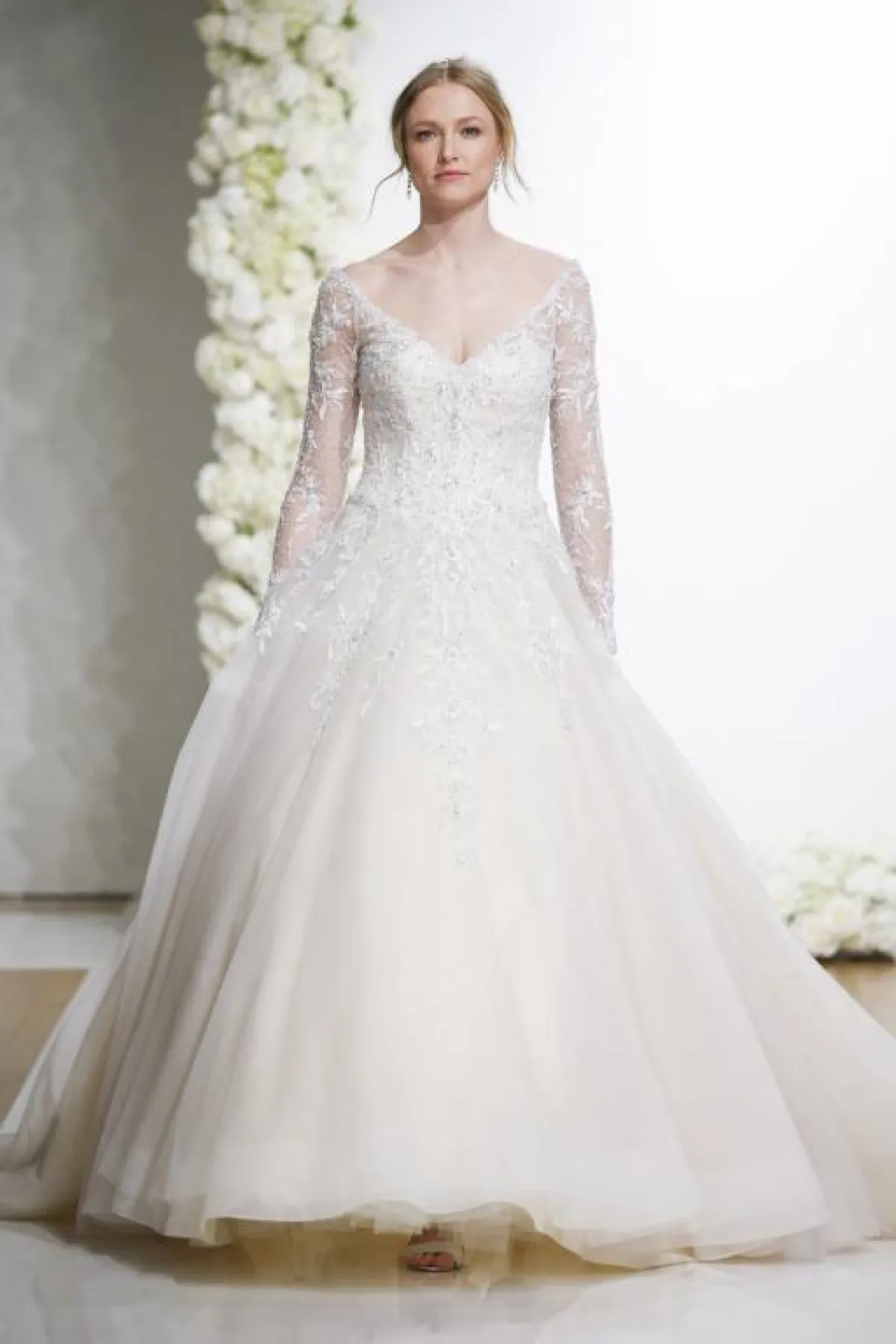 على الرغم من أنه تصميم ليس مخصصًا للعروس الممتلئة، إلا أننا نراه مناسبًا للعروس التي لديها بعض عيوب الجسم وتريد إخفاءها، بفضل طبقة التول الشفّافة التي تغطي الصدر والذراعين، مع تنورة تول مرصعّة بفصوص برّاقة مع قصّة الـA Line.
