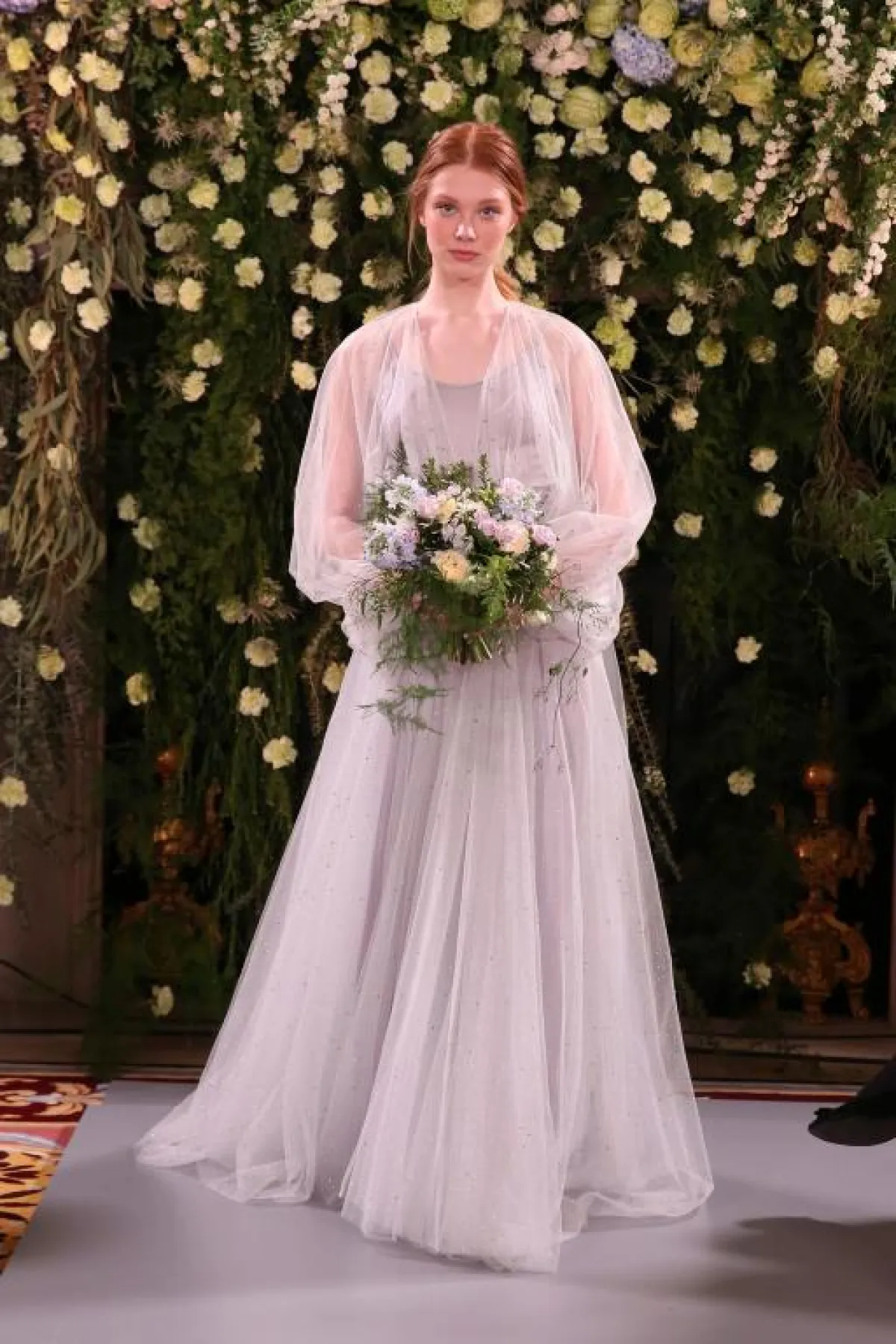 أمام التصميم الثاني فجاء بـ أكمام طويلة شفّافة ومطرزة بالورود البيضاء، ليخفي امتلاء الذراع أيضًا، مع تنورة تول واسعة.