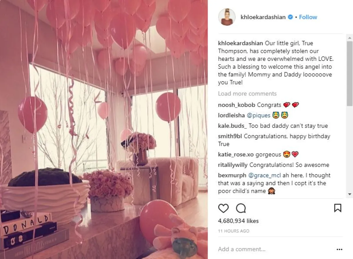 ونشرت النجمة البالغة من العمر 33 عامًا، صورة من استعداداتها لـ استقبال طفلتها الأولى في المنزل، وأرفقت الصورة بتعليق كتبت فيه :"ابنتي ترو تومسون، سرقتِ قلوبنا التي يغمرها الحب تجاهكِ، يا لها من بركة لاستقبال هذا الملاك في عائلتنا، والدتكِ ووالدكِ يحبانكِ يا ترو".