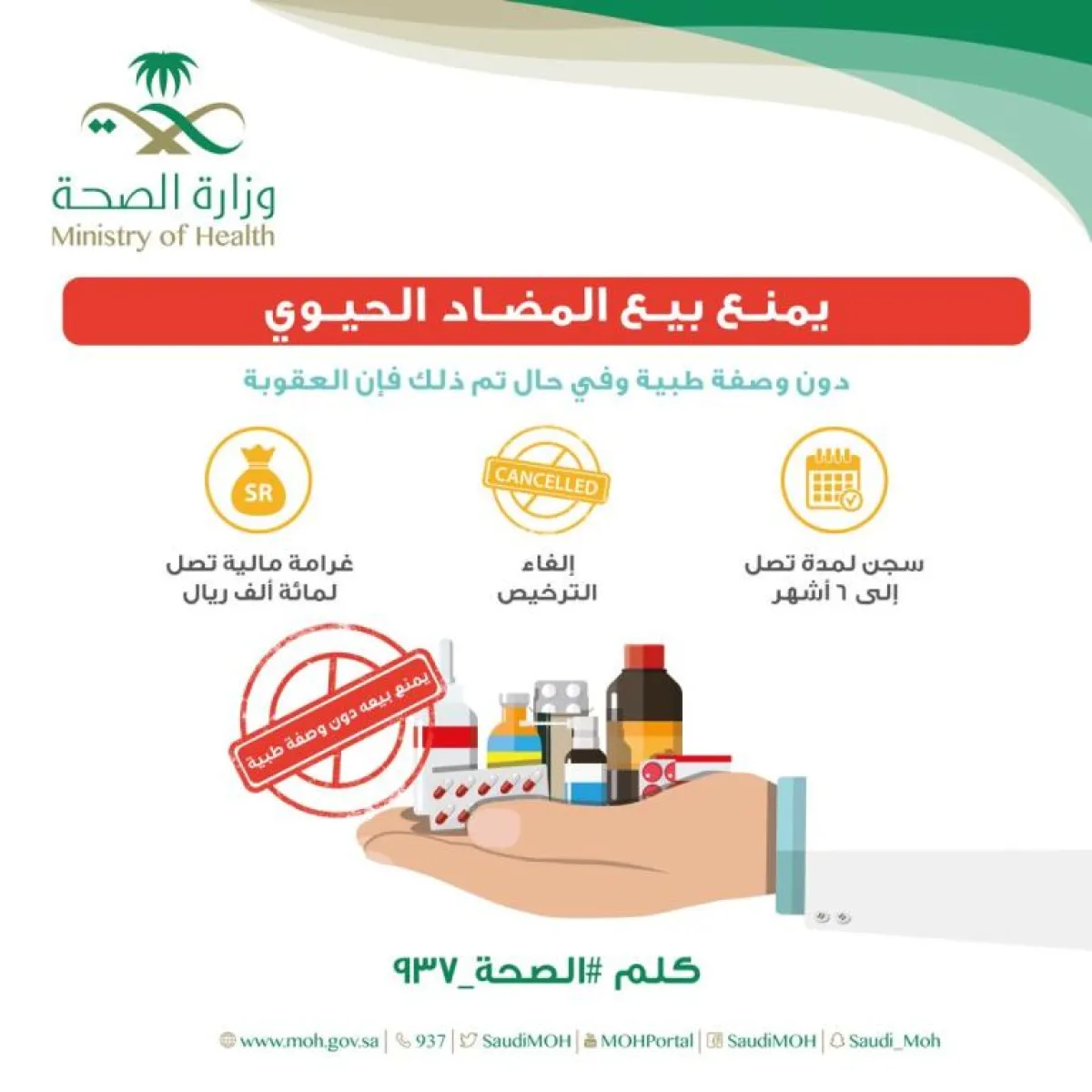 حذرت وزارة الصحة السعودية من بيع المضادات الحيوية من دون وصفة طبيّة، وفي حال حدوث ذلك فسوف يتعرّض مُخالف الأنظمة للعقوبة.