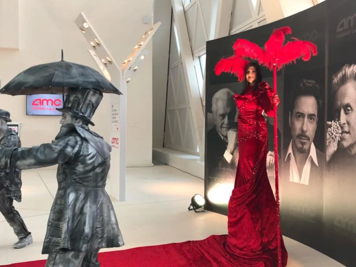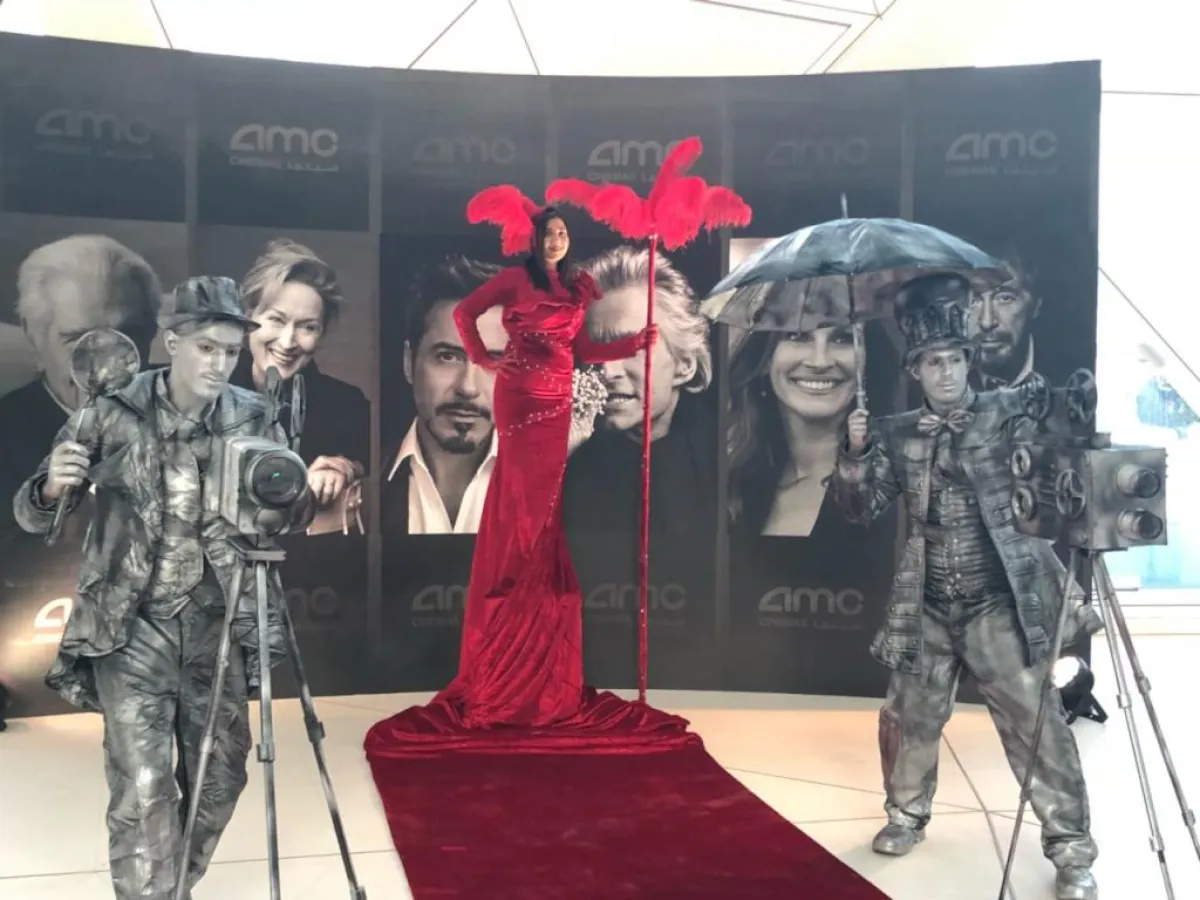 وتضمن مشهد الساحة الخارجية تجسيد شخصيات سينمائية كاريكاتيرية حيث يتجول أمامك "شارلي شابلن" بعصاه الشهيرة وبذلته البيضاء يصاحبه شخصية تمثيلية أخرى في مشهد تفاعلي خلاب يجسد لك عالم السينما على أرض الواقع.