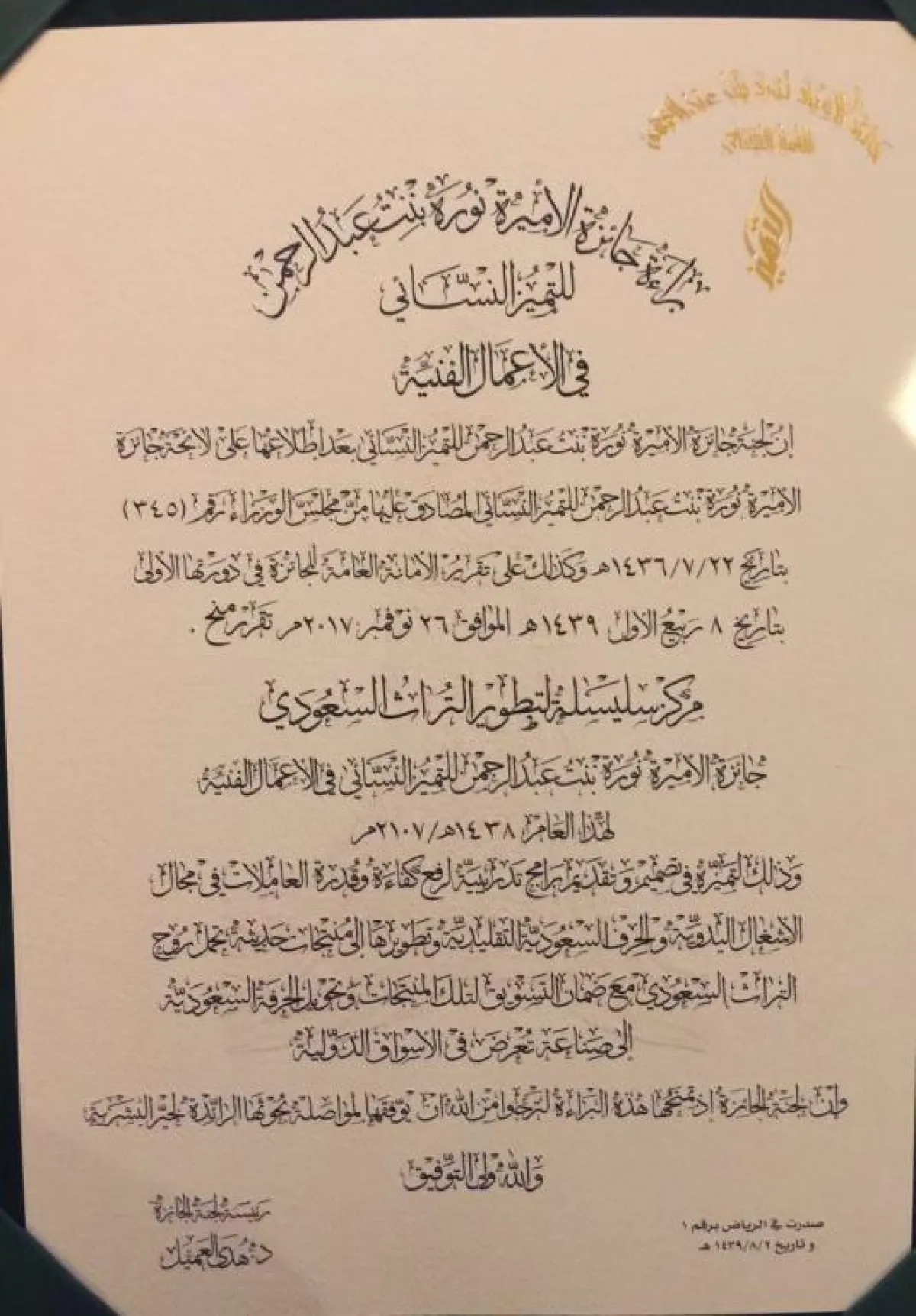تحت رعاية الملك سلمان بن عبدالعزيز، وبحضور الأميرة نوف بنت سلطان بن عبدالعزيز، كرَّمت جامعة الأميرة نورة بنت عبدالرحمن، الأربعاء 2 شعبان 1439هـ، الفائزات بجائزة الأميرة نورة بنت عبدالرحمن للتميز النسائي في دورتها الأولى، بحضور أميرات، وعدد من الشخصيات النسائية السعودية والعربية البارزة.