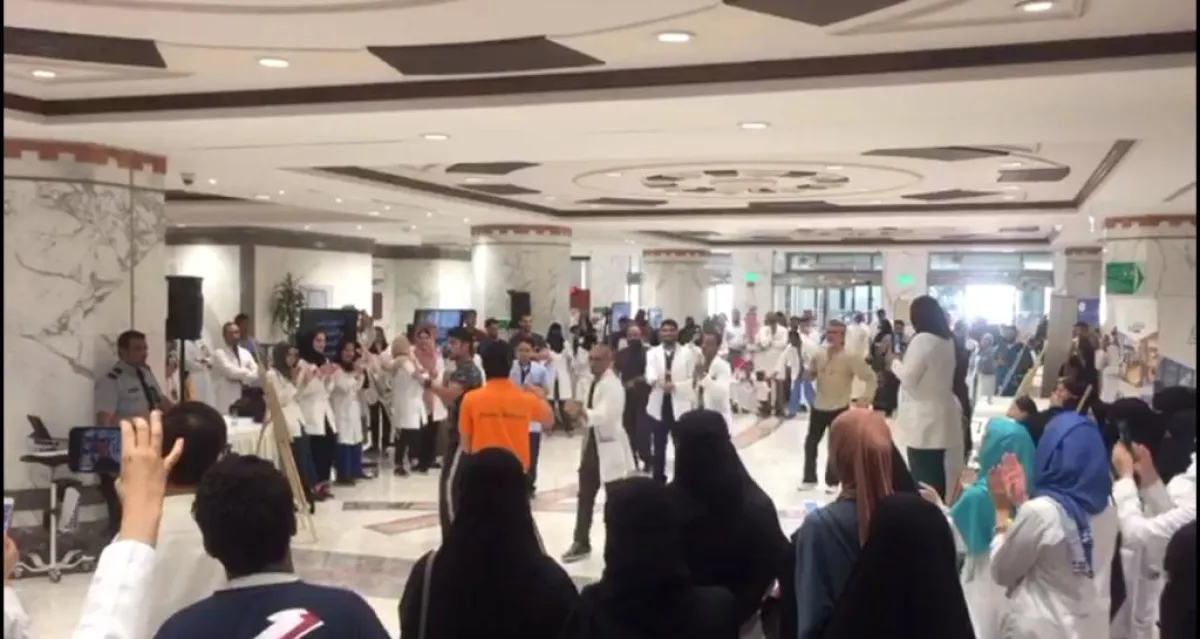 تجمهر عدد من الممرضين والمرضى والأطباء حول مجموعة من الممارسين الصحيين، الذين قاموا بأداء وصلة رقص داخل مستشفى الملك فيصل التخصصي بالرياض.