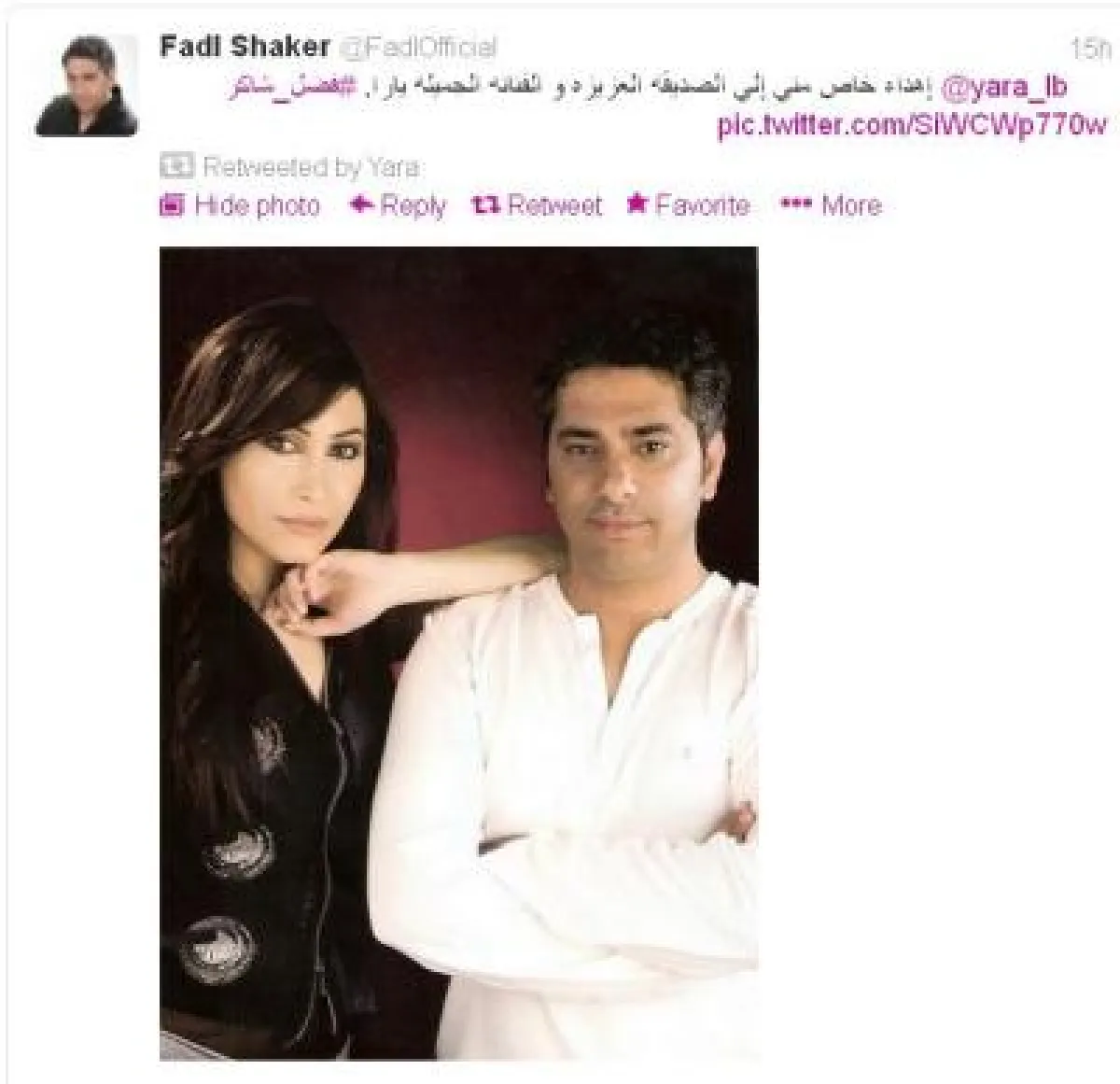 ويبدو أن يارا صدّقت أن فضل الذي نعت الوسط الفني بالقذر قبل أسابيع، عاد اليوم عن قرار اعتزاله وقام بإرسال صورة تجمعه بها، كتب عليها "إهداء خاص مني إلى الصديقة العزيزة والفنانة الجميلة يارا"، فقامت بريتوت للتغريدة دون أن تتأكد من الحساب.