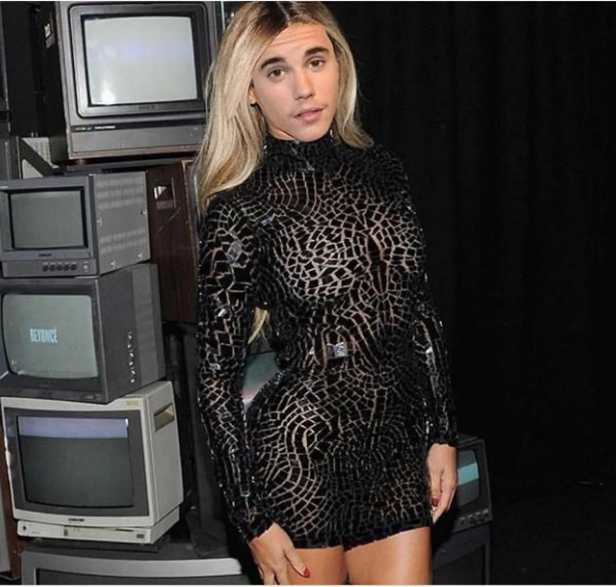 واللافت في الصورة أنها صورة مركّبة لجسم النجمة العالمية بيونسيه Beyonce موضوع عليها وجه جاستن، مع شعر أشقر طويل.