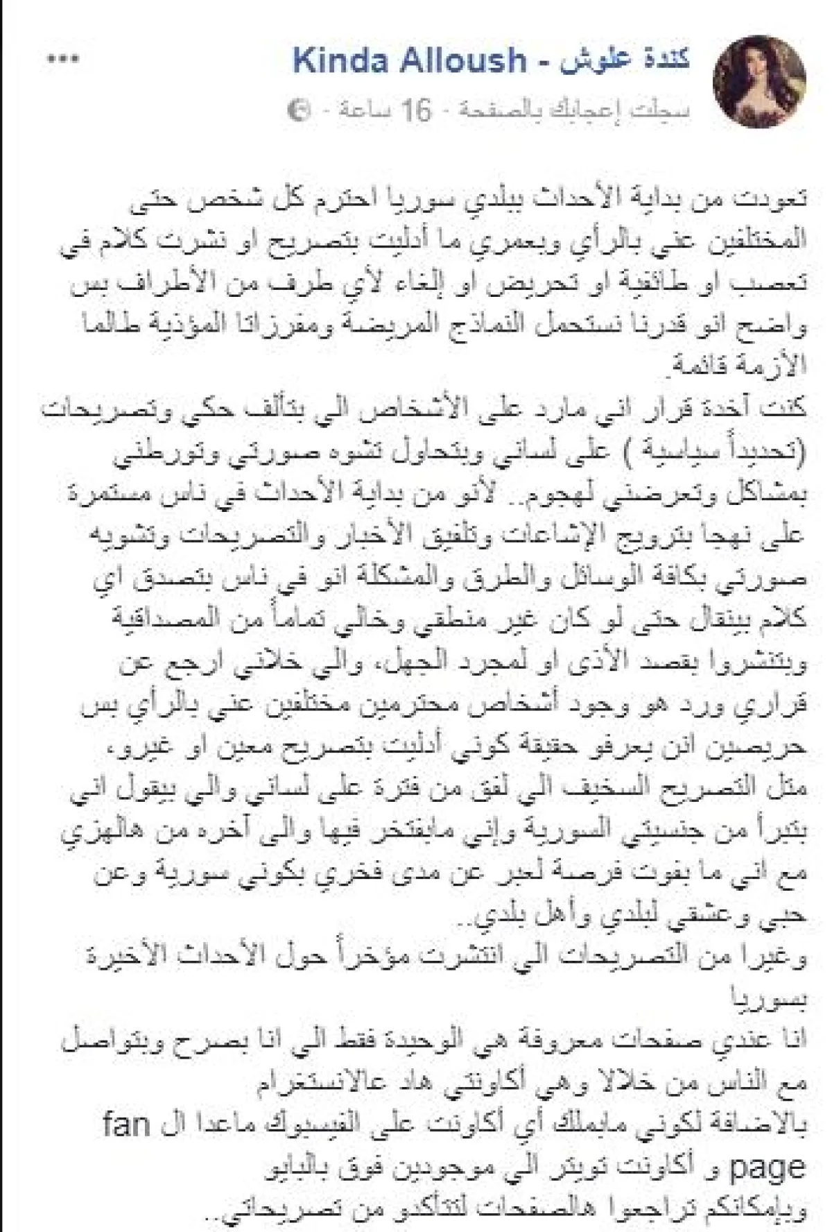 وقالت كندة في بيان وصفته بتوضيح عاجل: تعودت من بداية الأحداث ببلدي سوريا احترم كل شخص حتى المختلفين عني بالرأي وبعمري ما أدليت بتصريح او نشرت كلام في تعصب او طائفية او تحريض او إلغاء لأي طرف من الأطراف بس واضح انو قدرنا نستحمل النماذج المريضة ومفرزاتا المؤذية طالما الأزمة قائمة.