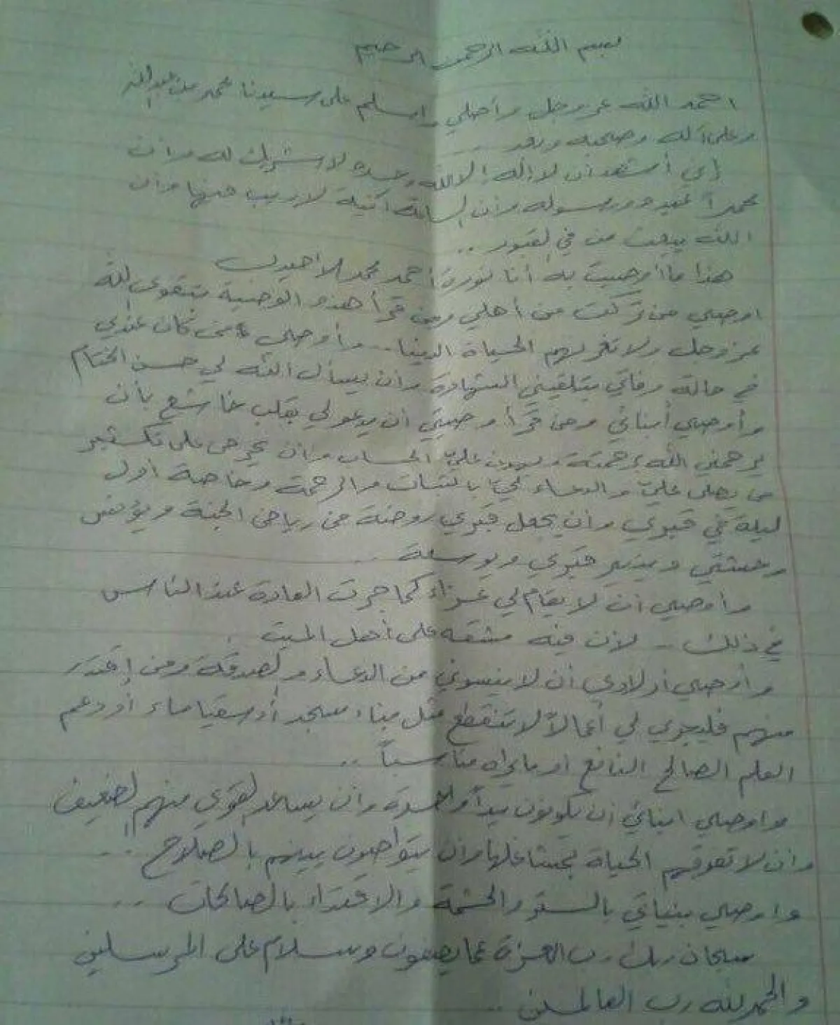 وأضافت "أوصي أولادي بألا ينسوني من الدعاء والصدقة، ومَن اقتدر منهم بأن يقدموا لي أعمالاً لا تنقطع، مثل بناء مسجد، أو سقيا ماء، أو دعم العلم الصالح النافع، أو ما يراه مناسباً".