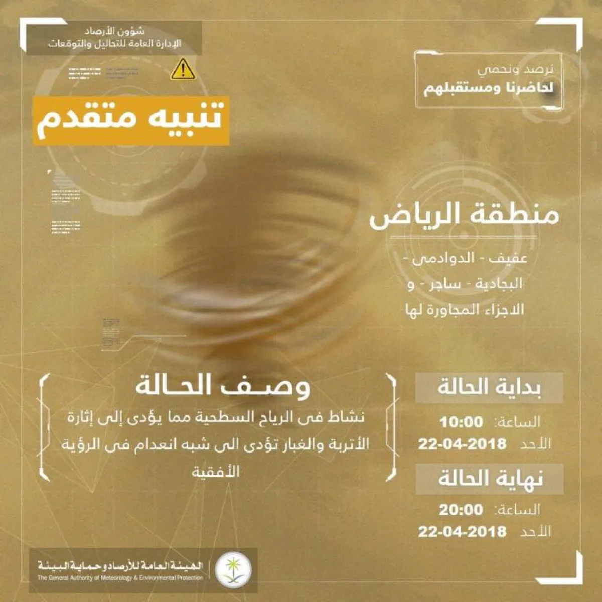 من جهة أخرى أطلق الإنذار المبكر تحذيرًا باللون الأحمر من استمرار تأثير العاصفة الرملية مما يؤدي إلى انعدام في مدى الرؤية الأفقية في الرياض، وتوقع الإنذار المبكر أن تمتد الحالة حتى السادسة من مساء اليوم على الرياض – الخرج – الدوادمي – الغاط – المجمعة – الأفلاج والأجزاء المجاورة.