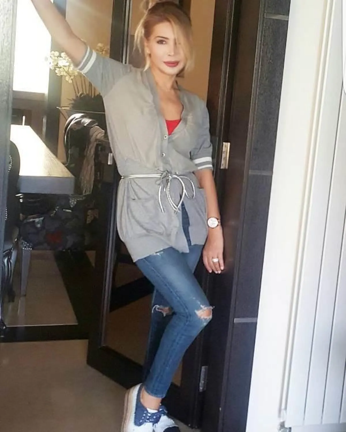 - البلوزة المورّدة من أنسب القطع التي ستضمن لكِ الظهور بقوام متوازن الشكل، أعتمديها مع جينز بقصة مستقيمة وحذاء بكعب بلاتفورم، كما في الاطلالة التي أحضرناها لكِ من انستقرام النجمة الذهبية.