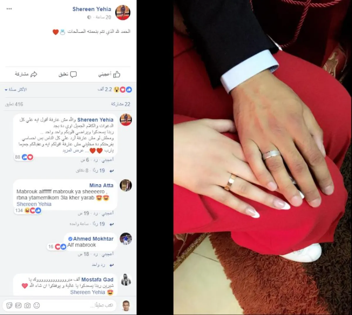 شيرين باغتت الجميع ونشرت عبر حسابها الشخصي بموقع الفيس بوك، صورة لكفّ يدها ويد العريس مع خاتم الخطوبة، وعلّقت عليها قائلة: الحمد لله الذي تتم بنعمته الصالحات، ووضعت قلبًا باللون الأحمر، ثم التزمت الصمت في ما يتعلق باستفسارات متابعيها حول هوية العريس.