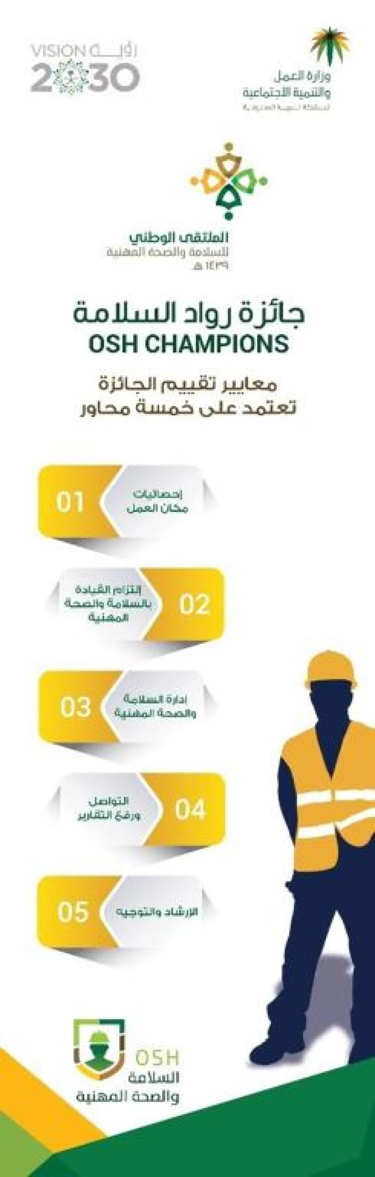 تعتزم وزارة العمل والتنمية الاجتماعية على هامش الملتقى الوطني للسلامة والصحة المهنية، الذي يبدأ يوم السبت بتاريخ 12 شعبان 1439 الموافق 28 إبريل 2018، في قاعة الملك فيصل للمؤتمرات بمدينة الرياض وعلى مدار يومين، إطلاق جائزة (رواد السلامة والصحة المهنية 2018)، تزامناً مع اليوم العالمي للسلامة والصحة المهنية.