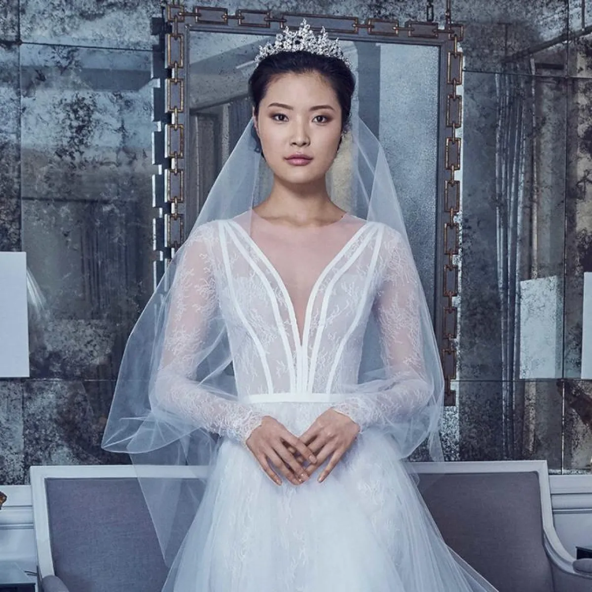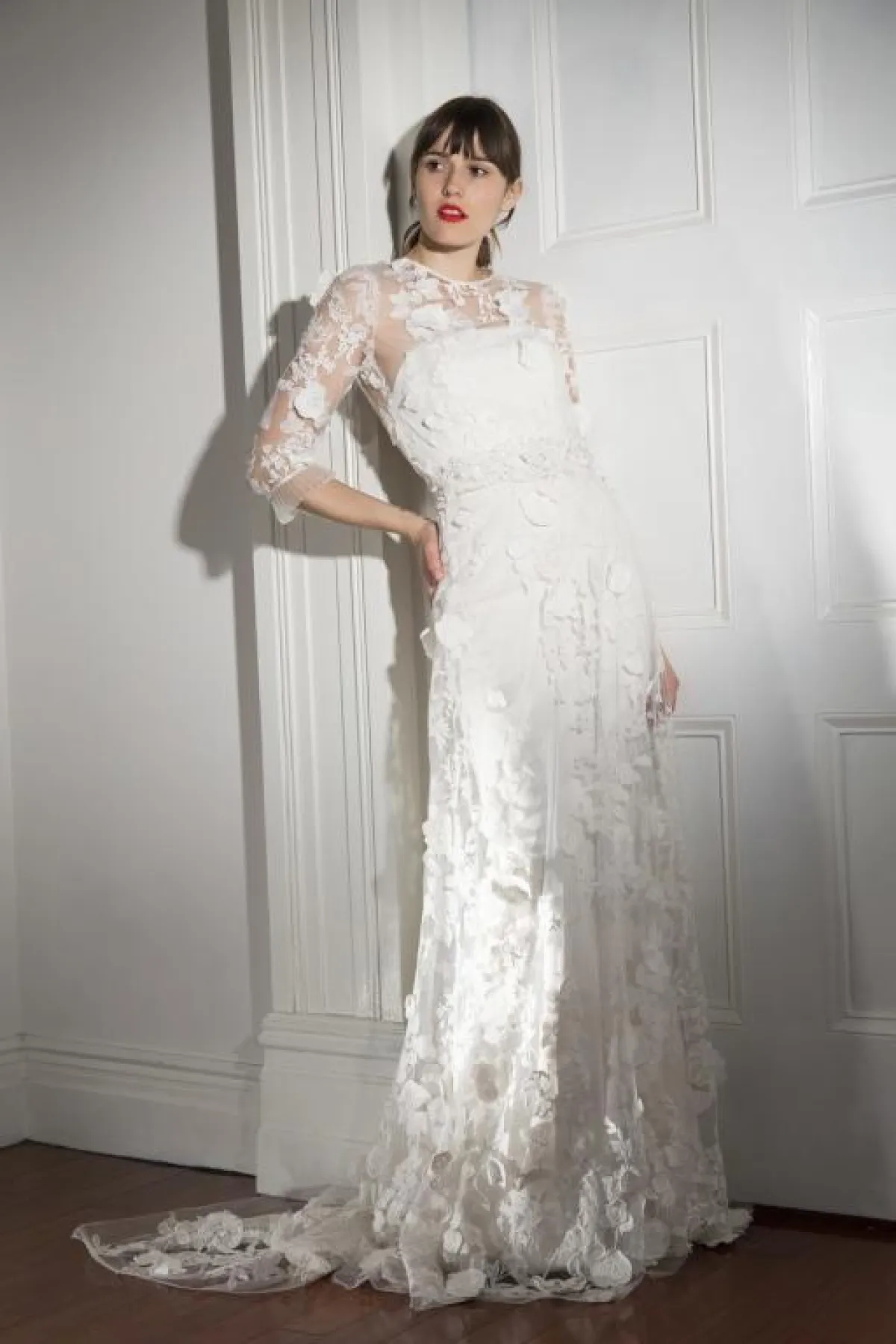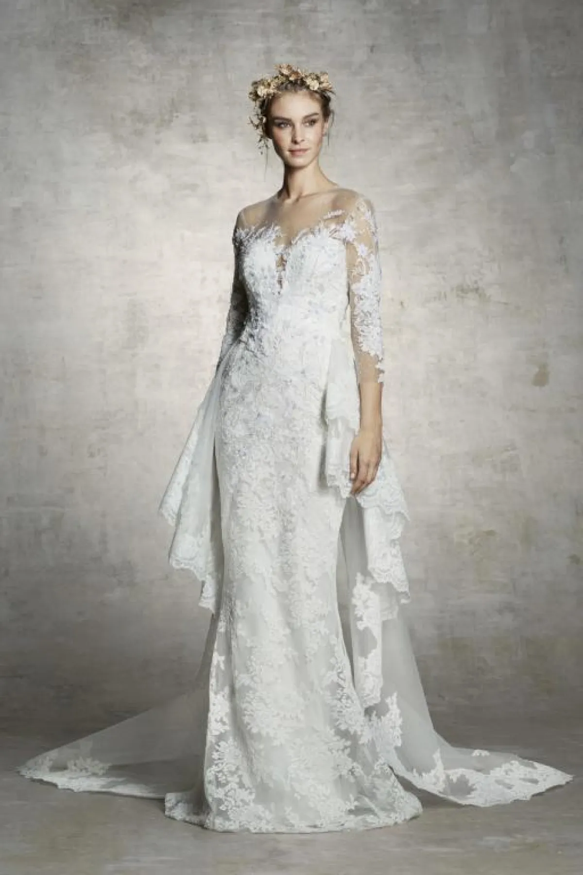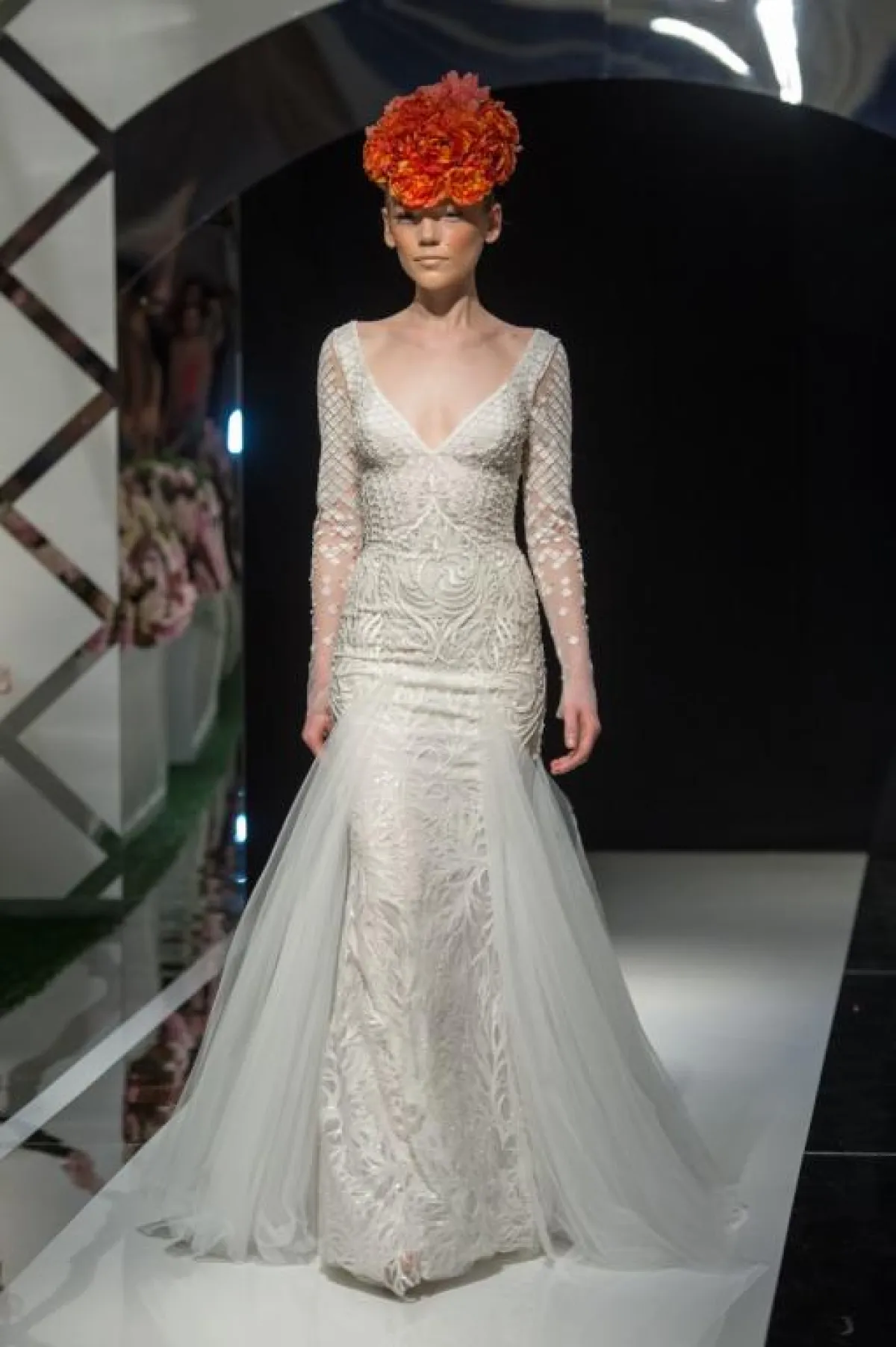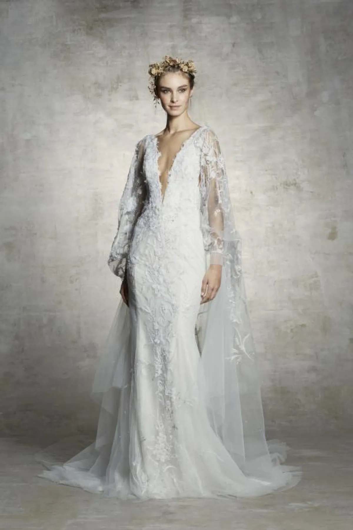 اعتمدت دار أزياء نعيم خان Naeem Khan التول والدانتيل والأكمام الطويلة، مع إبراز الخصر بالحزام، والدانتيل المهدول من الأجناب، لاطلالة أكثر رشاقة وجمالًا، واختاري معها الطرحة الطويلة، التي تغطي جزءًا كبيرًا من رأسك.