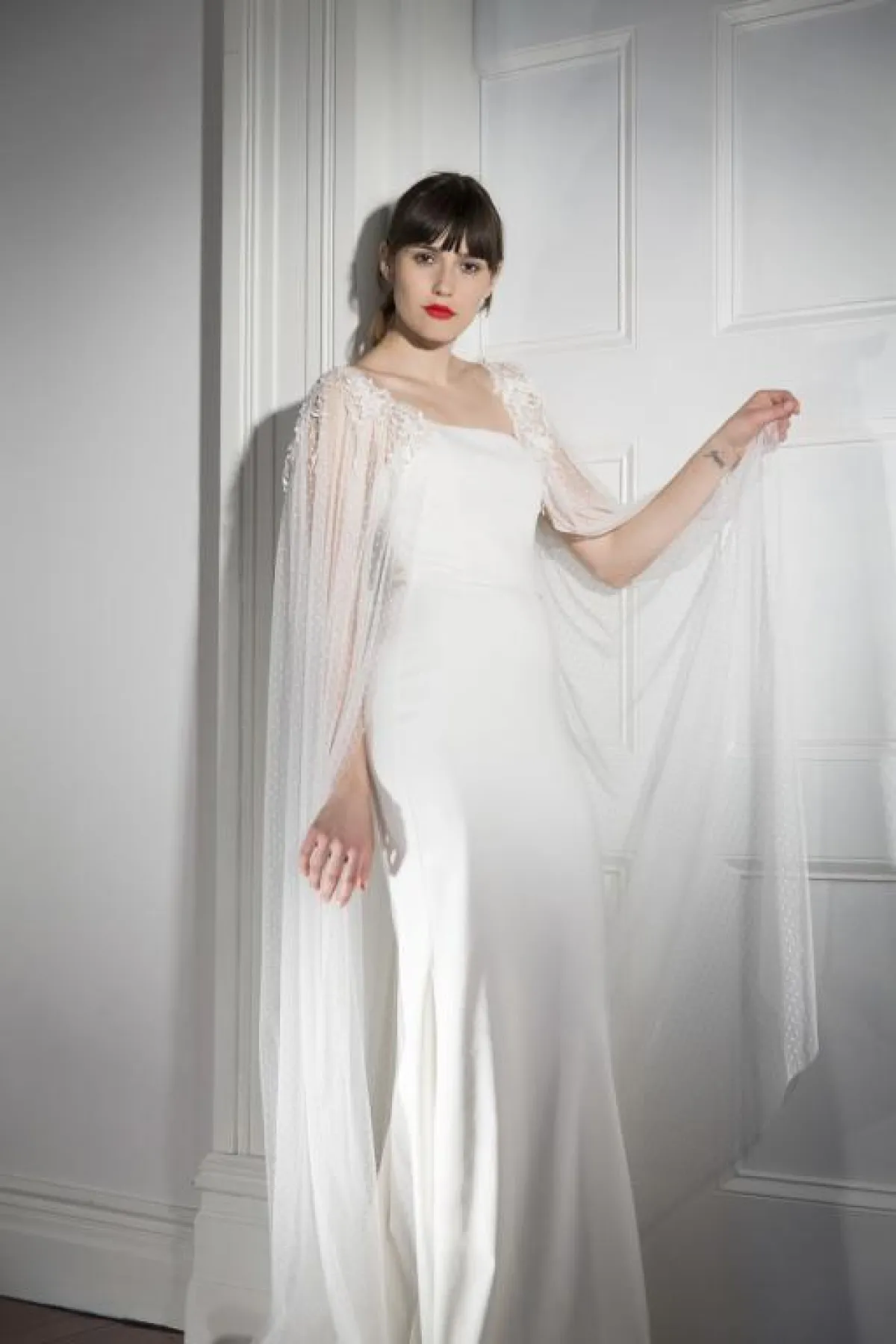 يمكنكِ اختيار تصميم السيرين بخامة الدانتيل الناعمة، مع تصميم الكتف الواسع الطويل جدًّا، المهدول من التول اللامع، واختاري معه طرحة طويلة أيضًا لامعة من خامة الأكتاف، مثل تصميم Halfpenny London هالفبيني لندن، ويناسب هذا التصميم عادةً الفتيات الطويلات، إذ يمنحهنّ طولًا وجمالًا.