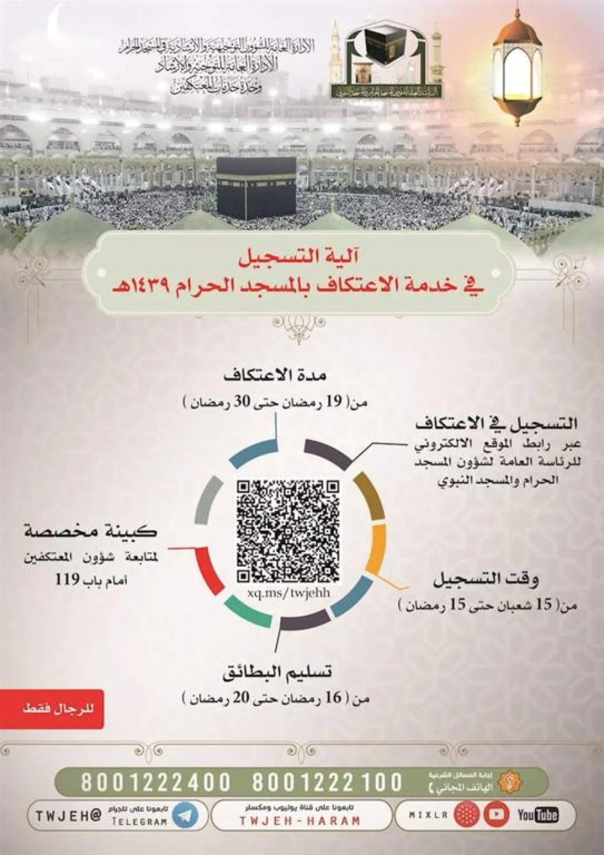 وأوضح مدير خدمات المعتكفين أن بداية التسجيل في خدمة الاعتكاف ستكون بتاريخ 15/8/1439هـ، عبر الموقع الإلكتروني للرئاسة العامة لشؤون المسجد الحرام والمسجد النبوي.