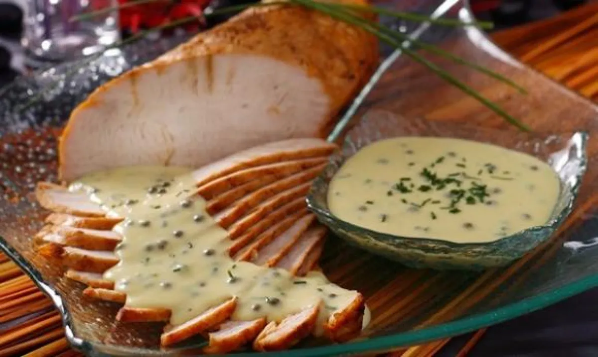 7-يقطع صدر الديك إلى شرائح، بعد أن يبرد تماماً، ترص في طبق التقديم ويسكب قليل من الصلصة فوقها.وتقدم الكمية المتبقية من الصلصة في وعاء منفصل.