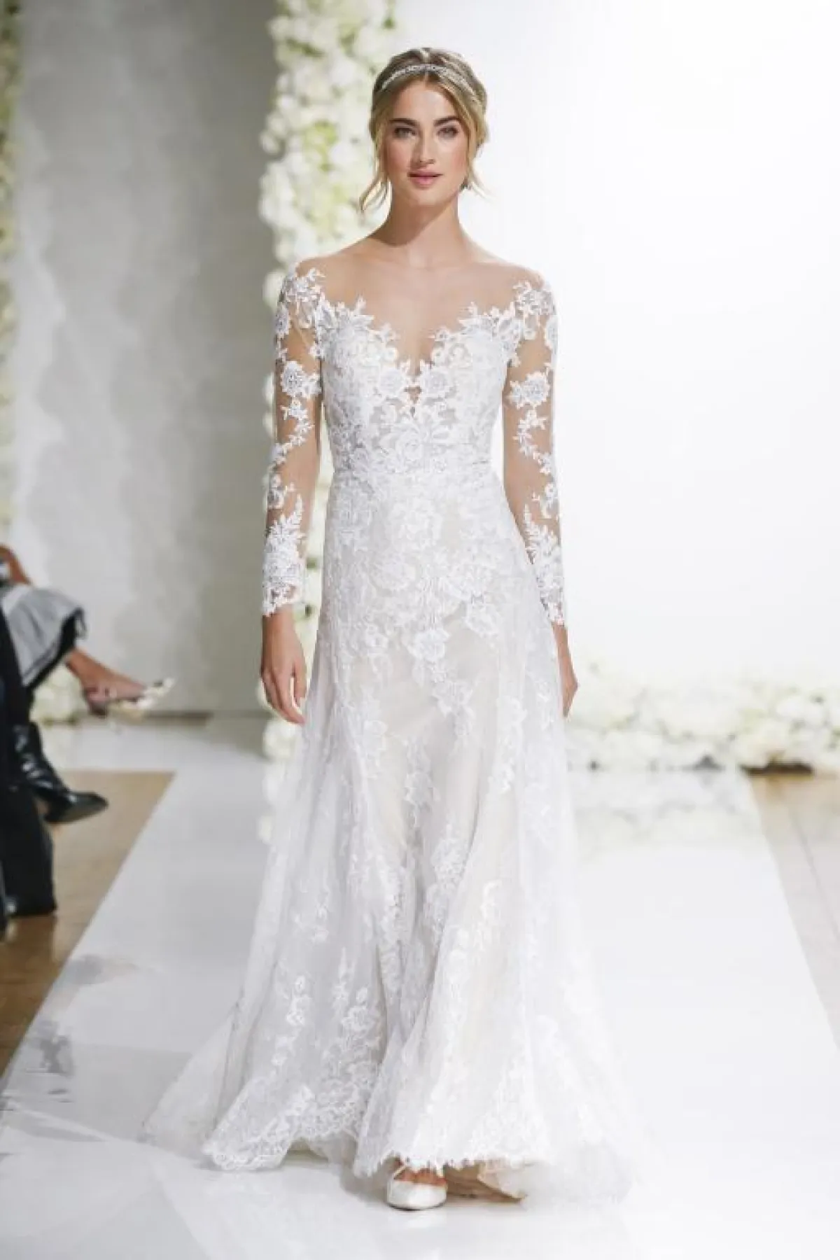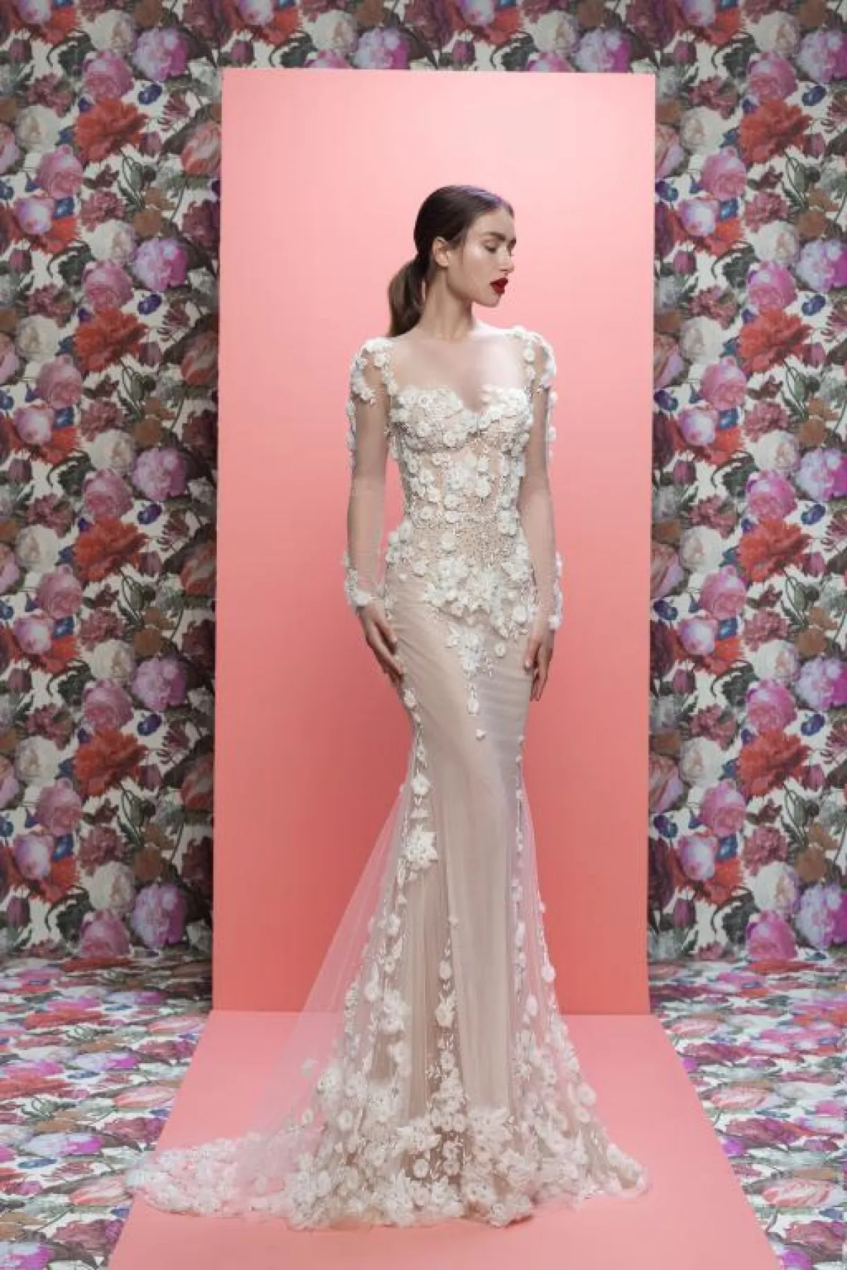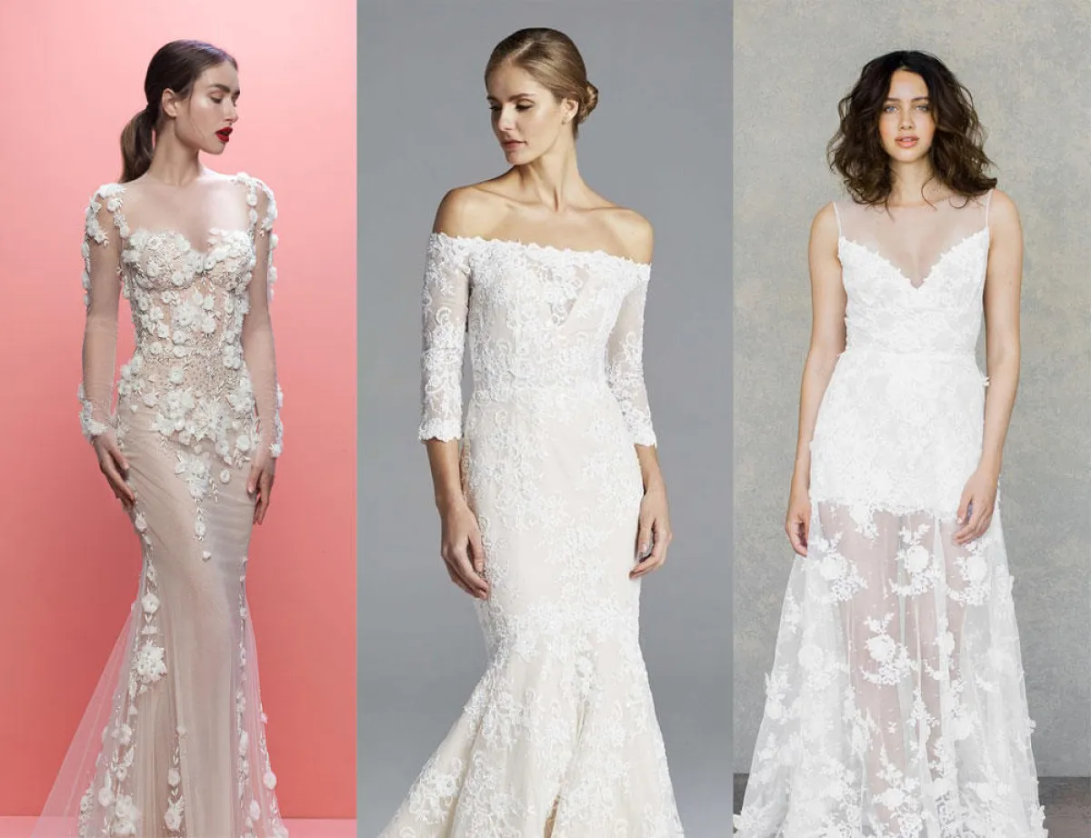 واستخدمت بعض الماركات قماش الدانتيل الراقي في فساتين الزفاف بالأكمام الطويلة؛ حيث تبرز الورود على القماش الشفّاف في الأكمام، مثل: فساتين مونيك لولييه Monique Lhuillier، Galia Lahav، Morilee، وبرونوفياس Pronovias.