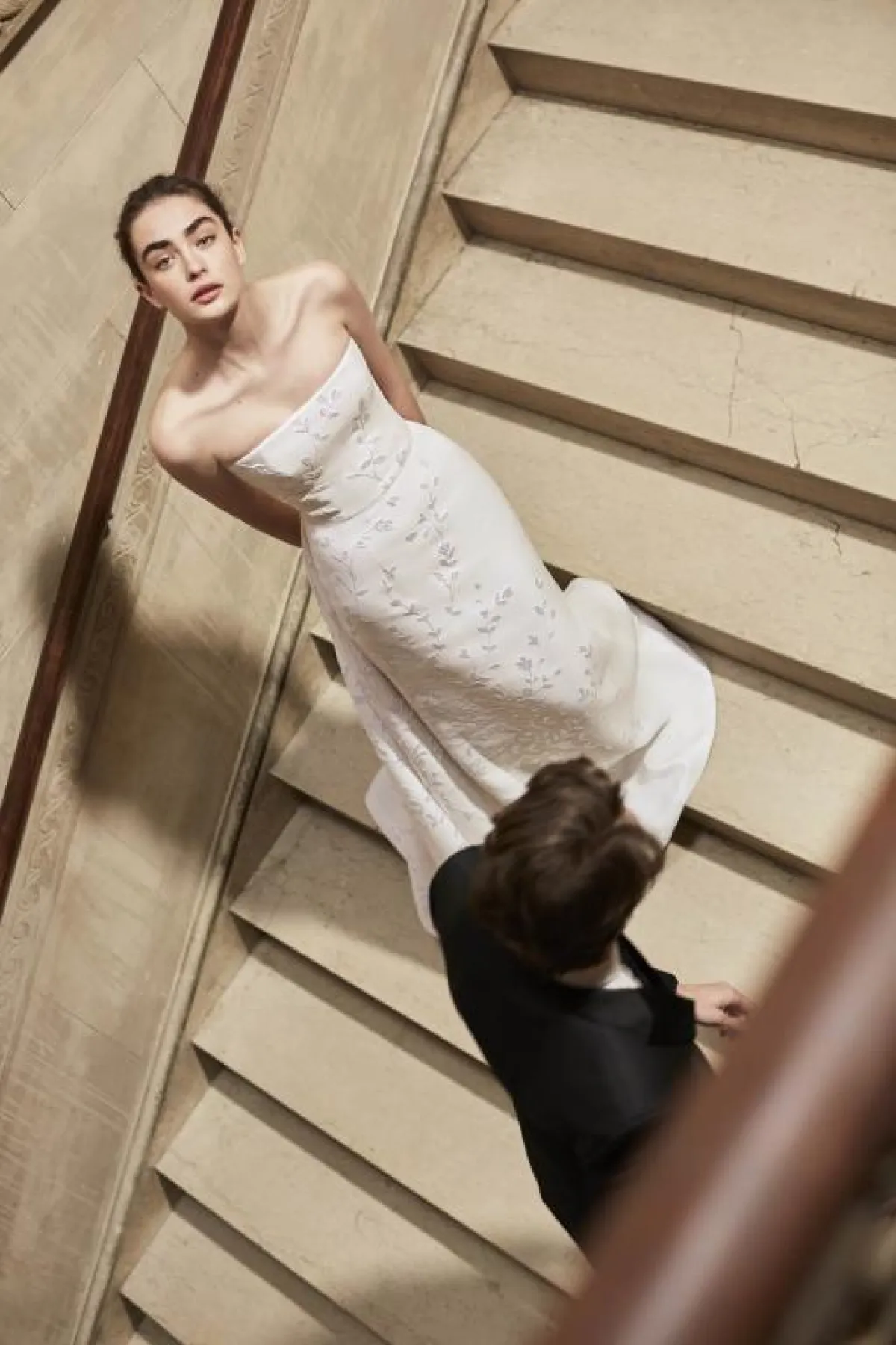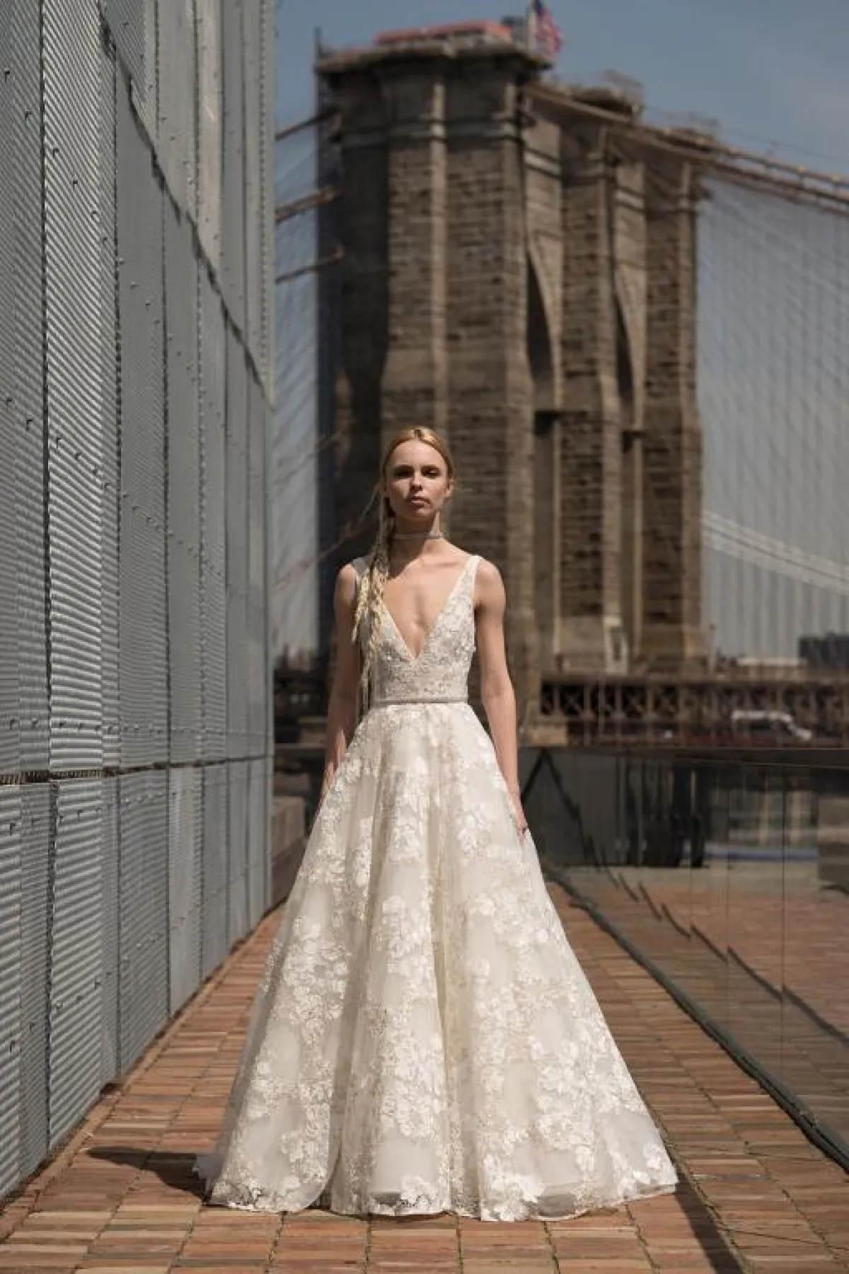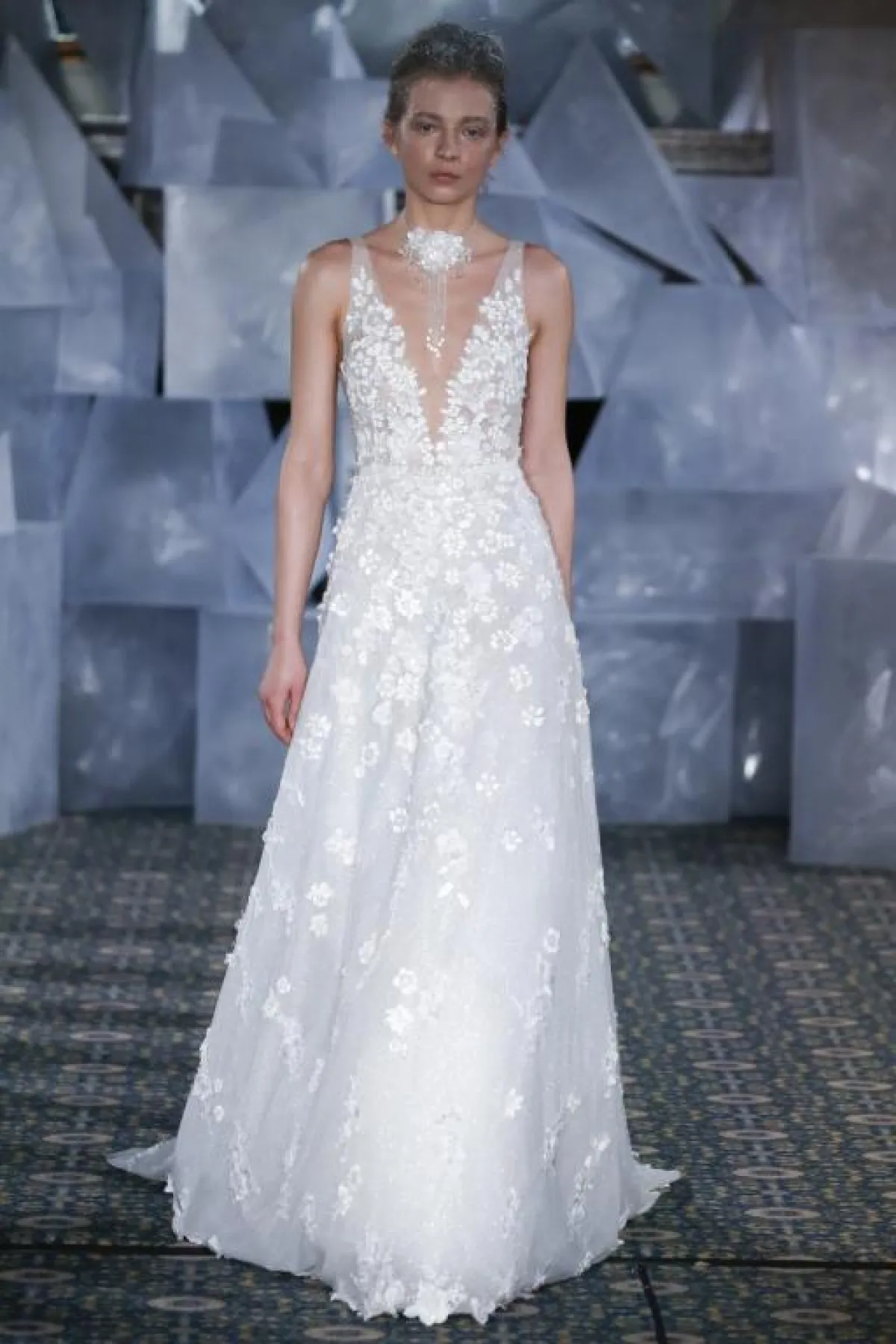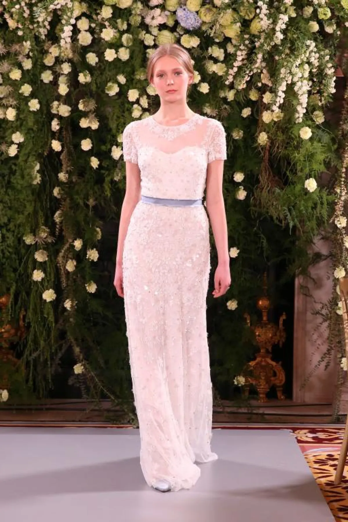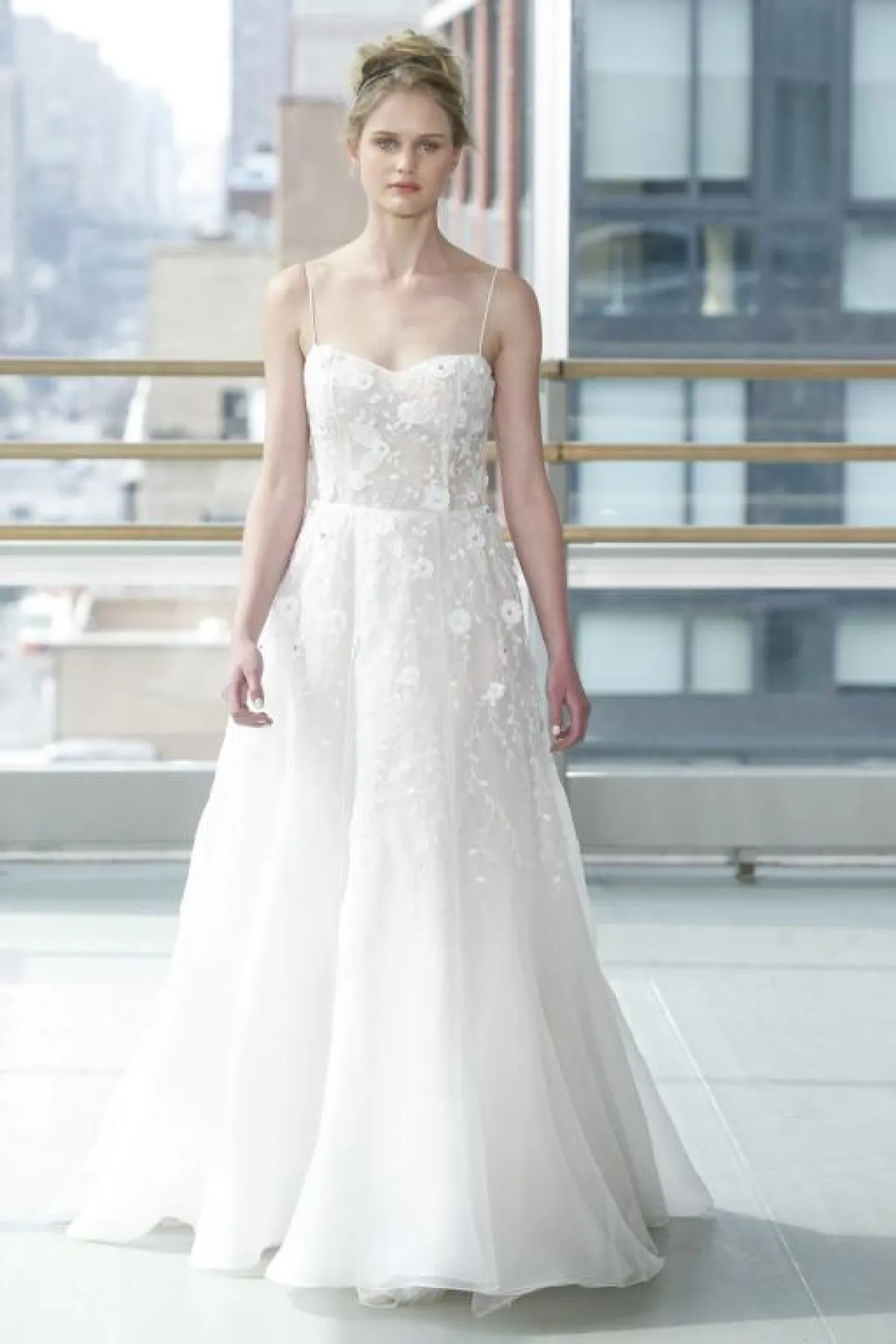كذلك برزت الفساتين بدون أكمام والمزينة بالورود لدى ماركات Alessandra Rinaudo، وكلير بيتيبون Claire Pettibone.