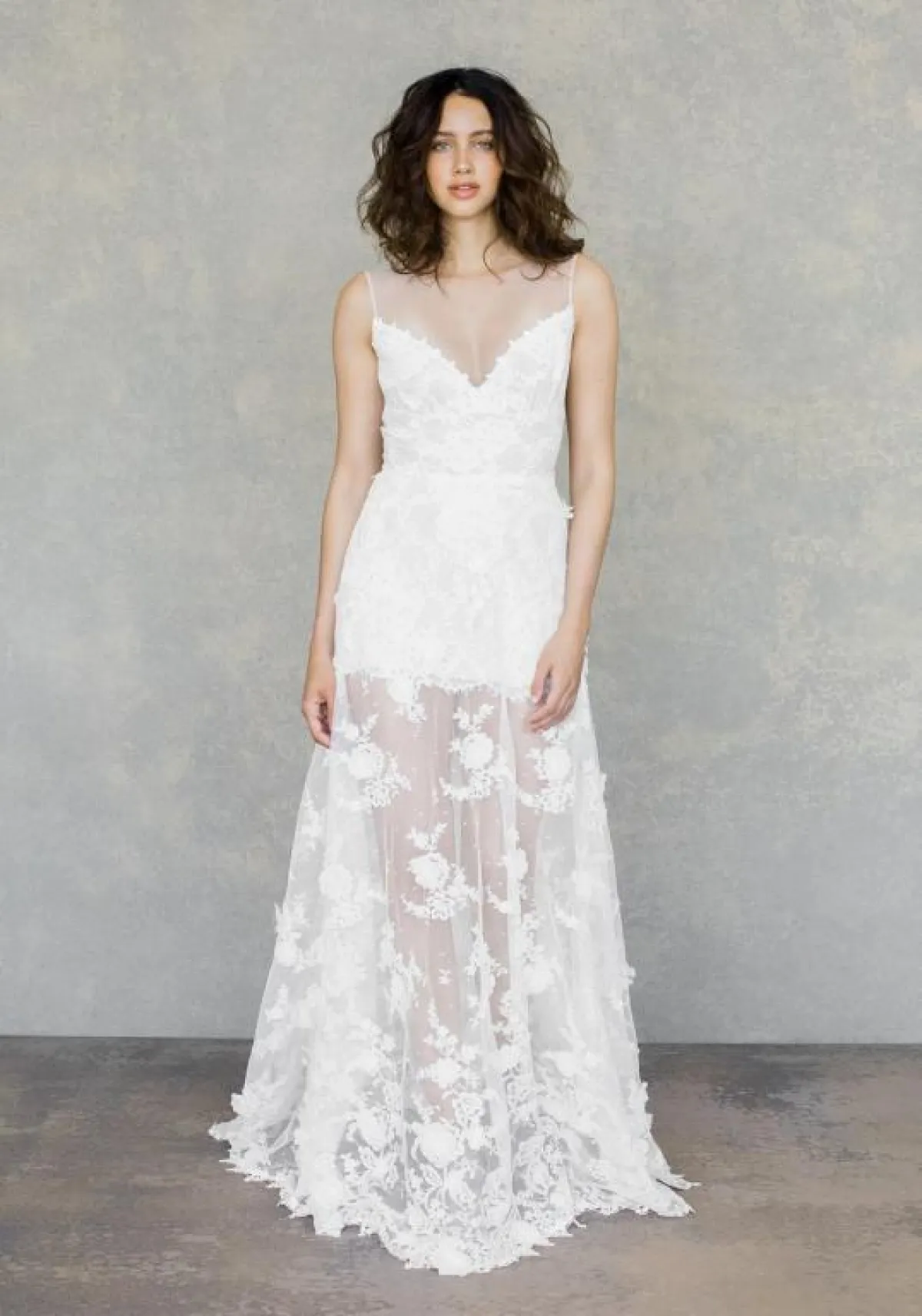 عادةً ما تكون فساتين الزفاف المزينة بالورود ذات تصاميم ناعمة ورومانسية؛ حيث أنها تغطي أقمشة شفّافة، وقدمت بعض الماركات فساتين زفاف بحمّالات مزينة بالورود البيضاء، سواء حمّالات رفيعة، مثل: فساتين Gracy Accad، لازارو Lazaro، أو حمّالات عريضة، مثل: فساتين ليلا روز Lela Rose ،Alyne by rita vinieris، وAlyne by rita vinieris.