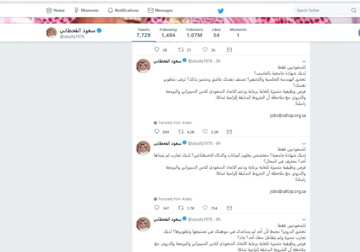 والوظائف المعلن عنها، هي كما نُقِلَ من حساب القحطاني في "تويتر":