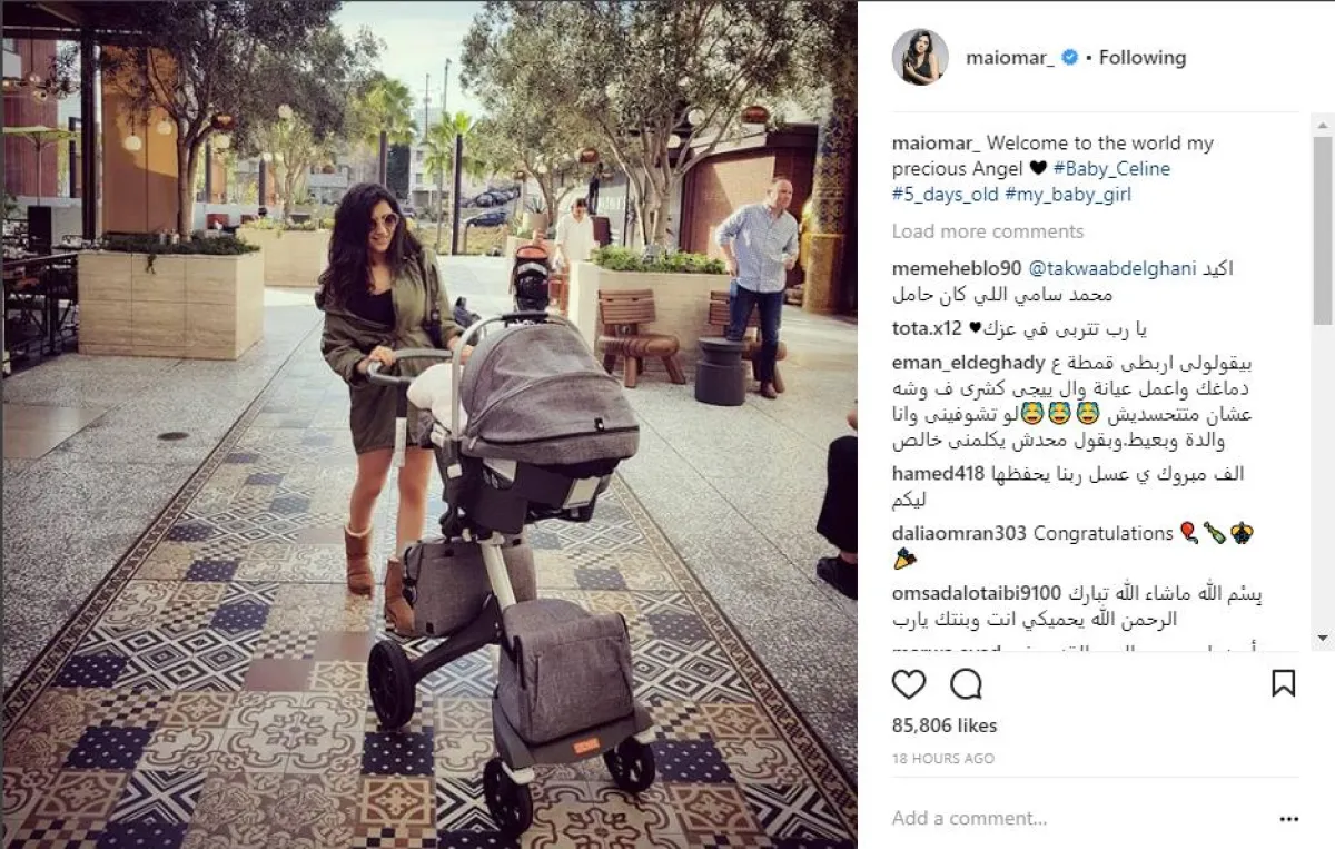 مي نشرت الصورة عبر حسابها الموثق بموقع انستقرام، وعلقت عليها قائلة: مرحبا بكِ يا صغيرتي في عالمنا.. سيلين 5 أيام.
