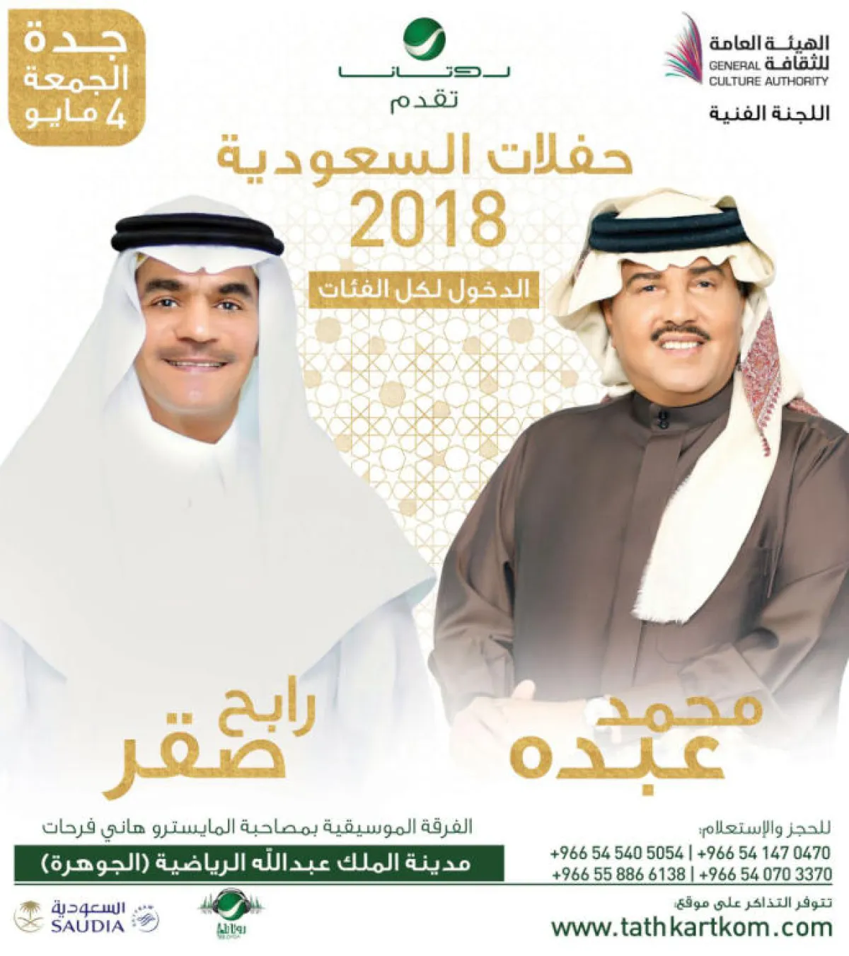 لأول مرّة تبدأ الهيئة العامة للثقافة بالتعاون مع شركة "روتانا" للصوتيات والمرئيات بإقامة أولى الحفلات الغنائية للعائلات، والتي يحييها الفنانان د. محمد عبده ورابح صقر يوم الجمعة بعد القادم (4-5-2018م) في الصالة المغلقة بمدينة الملك عبد الله الرياضية "الجوهرة" بجدة، والدخول لكل الفئات، كما جاء في "بوستر" الحفلة الذي وزعته شركة "روتانا" في مواقع التواصل، والتي تعود من خلاله إلى نشاطها وإحياء الحفلات في جدة، ولتسجّل من خلاله أولى الحفلات التي تنظمها في السعودية لكل فئات المجتمع، والحفل الثاني بعد حفل الفنان د. عبادي الجوهر الذي أحياه للجنسين في مدينة الملك عبد الله الاقتصادية قبل أسبوعين.
