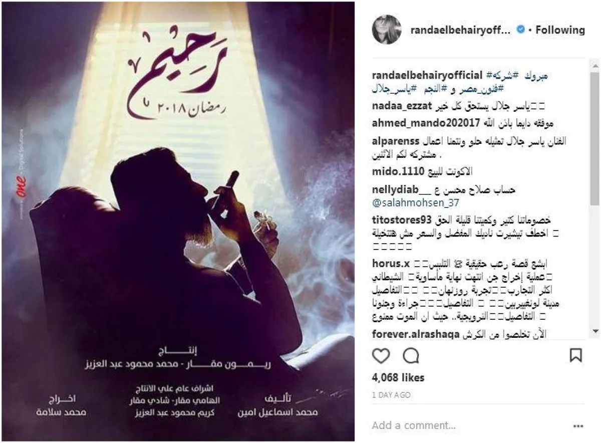 نشرت النجمة المصرية راندا البحيري صورة لأفيش مسلسل ياسر جلال «رحيم»، الذي سيخوض به الموسم الرمضاني وكتبت بجوار الصورة تعليقاً تشوق به الجمهور لمشاهدة الفنان ياسر جلال في رمضان، قالت به: «انتظروا النجم #ياسر_جلال في #مسلسل_رحيم علي قناة CBC Egypt في رمضان 2018».