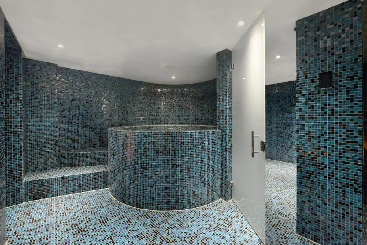 في الحمَّام الرئيس، تفصل ألواح الزجاج الشفَّاف بين الأجزاء.