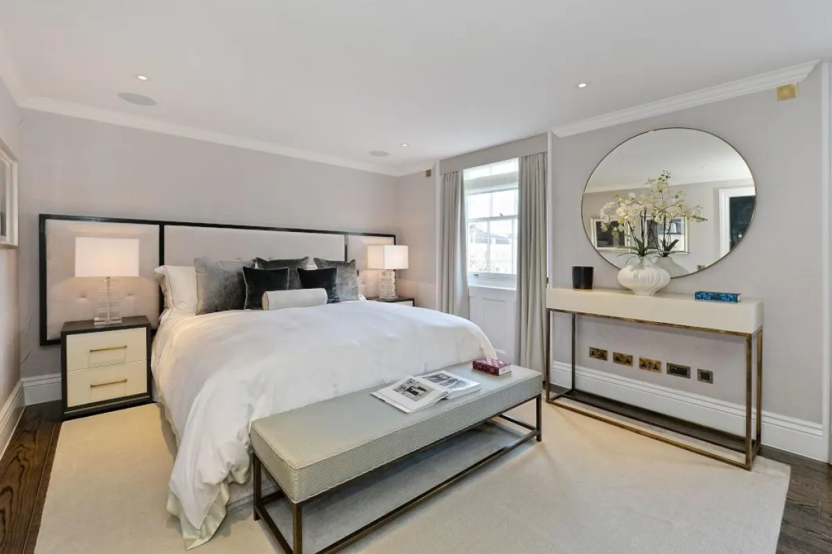 من جهةٍ ثانيةٍ، تتصف غرفة النوم الرئيسة بالهدوء، ولا توفِّرها الفخامة بمعيَّة الأقمشة وطريقة توزيع قطع الأثاث.