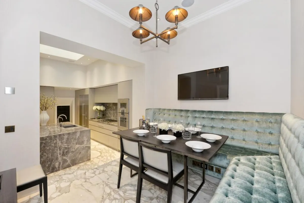 قبالة قاعة المدخل، تتمركز غرفة طعام رسميَّة تتسع لحوالى 14 فردًا، ومطبخ عائلي "مودرن" ينفتح على غرفة الفطور المؤثَّثة بأريكة تمتدُّ على شكل حرف "إل" باللاتينية، مكسوة بالقماش الأخضر المخمل الناعم، والمُكبَّس بالأزرار، بالإضافة إلى مقعدين توسَّطهما طاولة خشب.