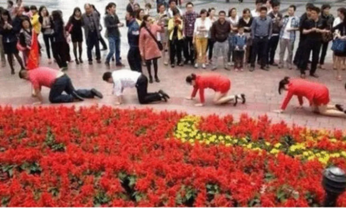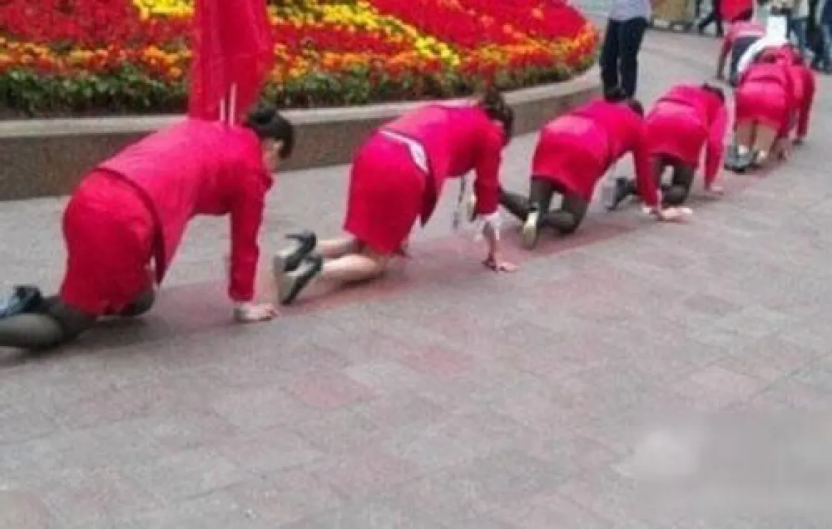 شهد الشارع الصيني في مدينة "تشونغتشينغ" حدث غريب من نوعه، فوجئ المارة في أحد الأحياء التجارية الصينية المزدحمة بمدير شركة مستحضرات تجميل يجبر موظفيه على الركوع في الشارع والزحف على أرجلهم وأيديهم.
