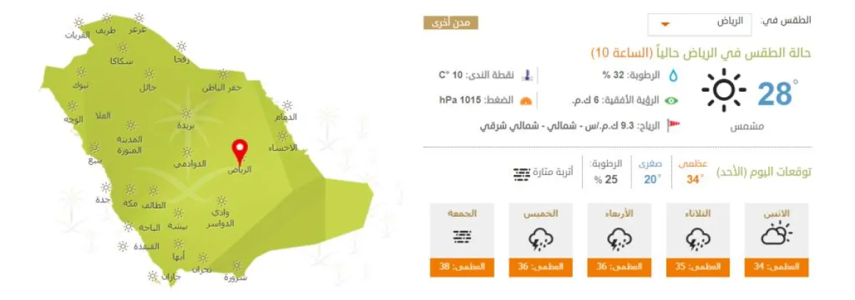 توقعت الهيئة العامة للأرصاد وحماية البيئة السعودية، أن يشهد هذا الأسبوع استمراراً للسحب الرعدية، والأمطار على منطقة الرياض ومحافظاتها، مع نشاط في الرياح المثيرة للأتربة.