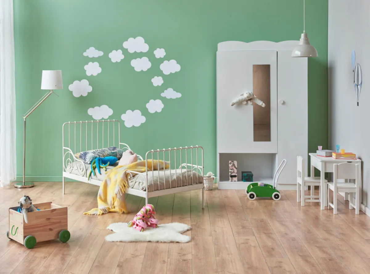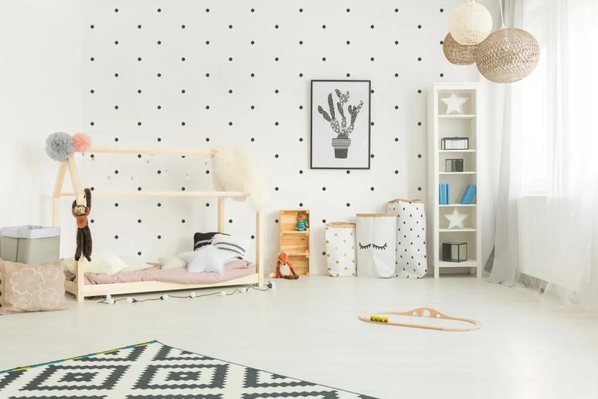 | يُفضَّل البعد عن توزيع كمٍّ كبيرٍ من قطع الأثاث بشكل عشوائيّ في هذه غرفة النوم، بل من المُستحسن إيداع مساحات فارغة للسماح للطفل بالحركة.