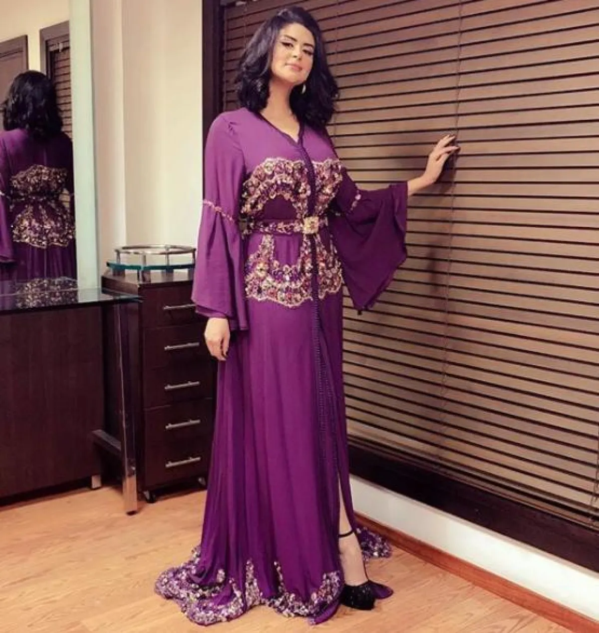 اختارت سلمى رشيد لإحدى المناسبات قفطانًا من قماش الحرير باللون البنفجسي، مطرزًا ومشكوكًا بالترتر الذهبي، وقد نسقت معه حذاءً أسود بكعب عالٍ، وبدت اطلالتها به أنيقة ولافتة.