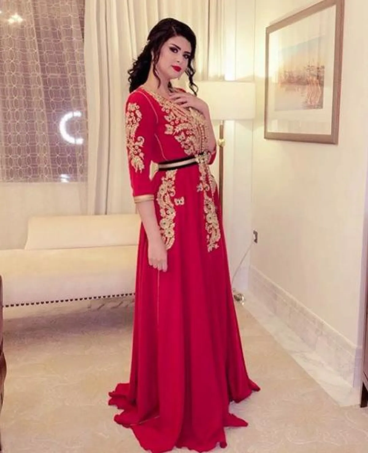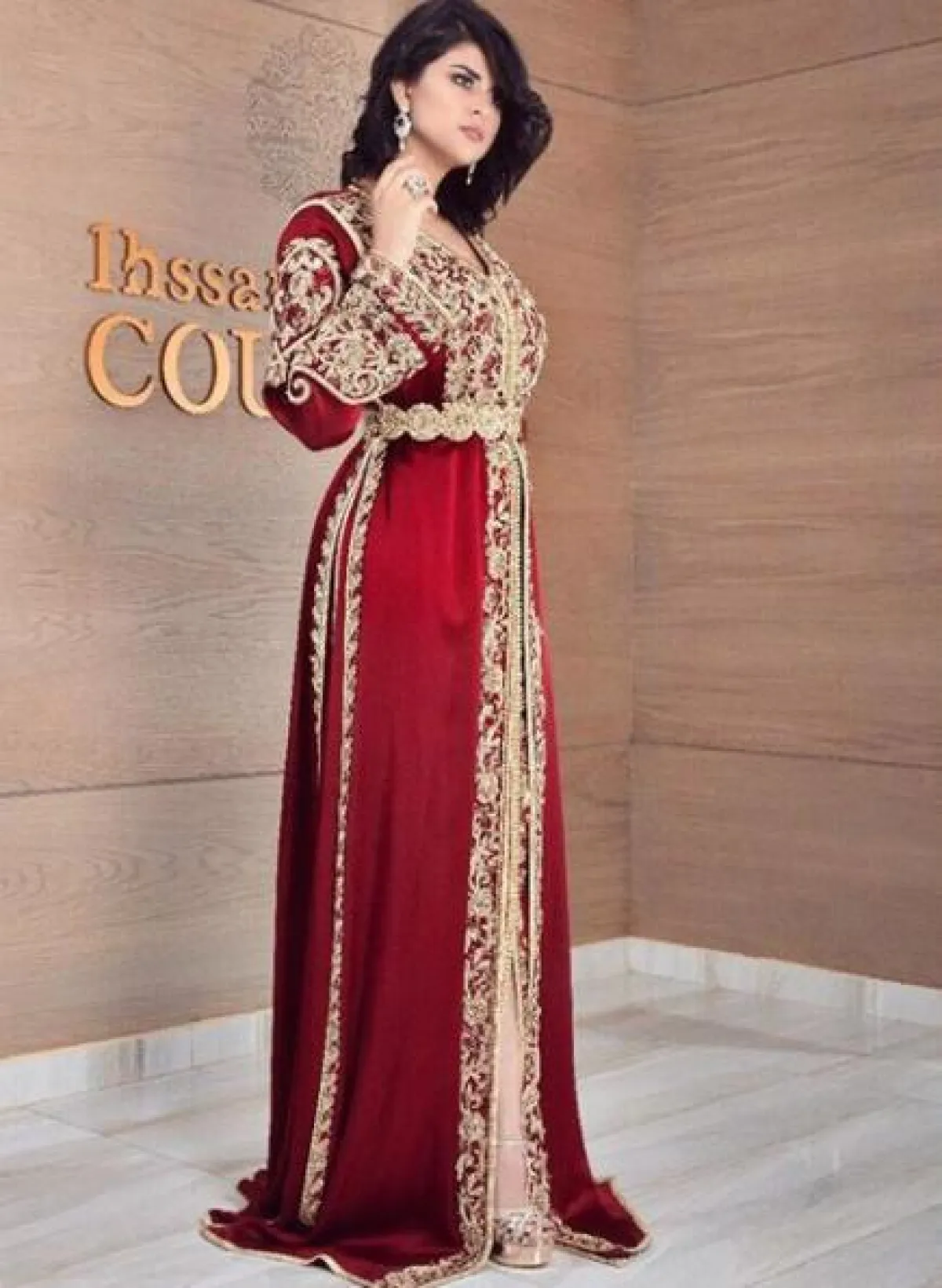 سلمى رشيد في اطلالة فاخرة، اختارت فيها قفطانًا مميّزًا من الحرير باللون الأحمر، ومطرزًا بشكل لافت بخيوط ذهبية، مع حزام ذهبي على الخصر، وزينت اللوك بمجوهرات ماسية.